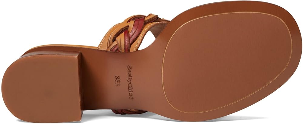 Add a bohemian touch to your elegant look wearing the See by Chloe Pompoms Sandal. Calfskin upper. Cow leather and goatskin lining and insole. Slip-on style. Braided leather detail on the upper. Block heel construction. Rubber outsole.