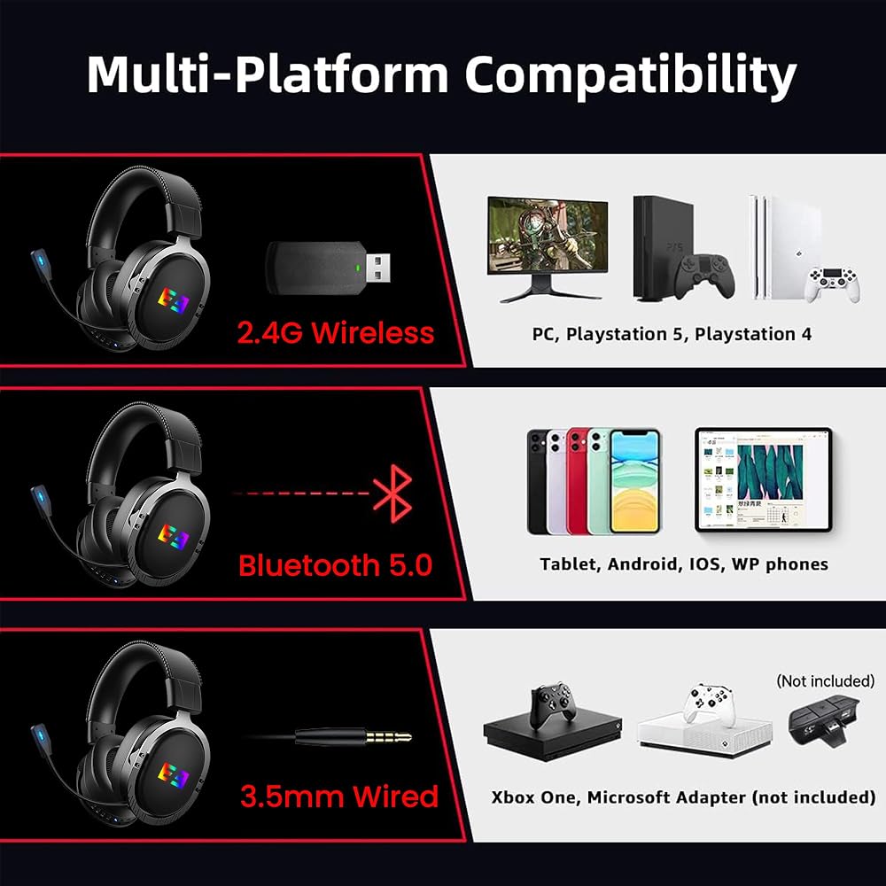 اتصال ثلاثي الأوضاع وتوافق متعدد المنصات - تجمع سماعات الألعاب اللاسلكية Seenda بين 2.4 جيجا هرتز لاسلكيًا بدون خسارة لصوت الألعاب الاحترافي على الكمبيوتر الشخصي وPS5 وPS4، مع راحة اتصال Bluetooth 5.0 المتزامن لمعظم أجهزتك المحمولة مثل الهواتف المحمولة، الأجهزة اللوحية وأجهزة iPad. سلسلة Xbox متوافقة فقط مع الوضع السلكي مقاس 3.5 ملم.