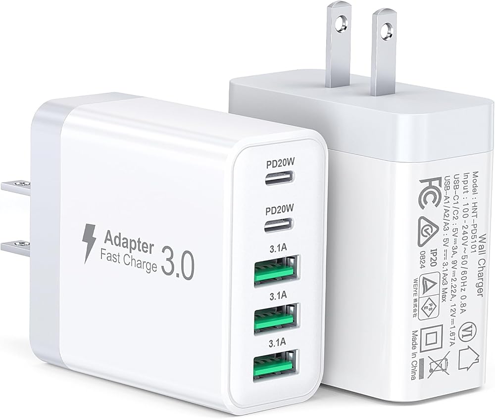 50W 5-Port USB C Charger Block: Multi USB C Charger are the trend of the new era, providing a one-stop solution to our charging needs. USB charger block has 2 USB-C 3 USB-Aports. The USB C port has a maximum output of PD20W, the USB port has a maximum output of 3.1 A/5 V, and the total power is up to 50W. Save time and space and charge 5 devices simultaneously.