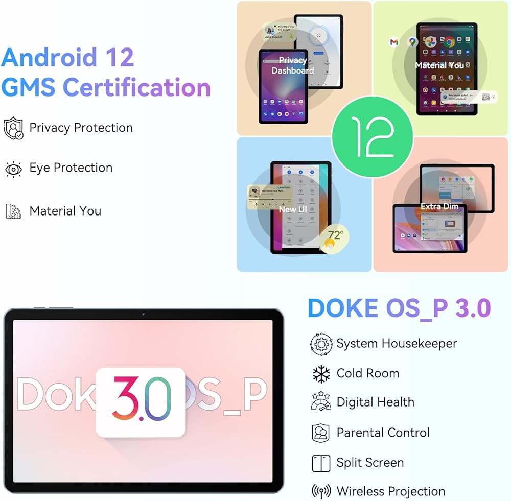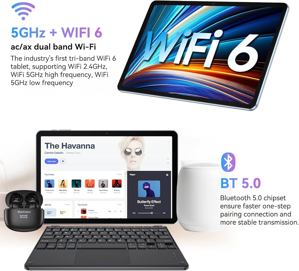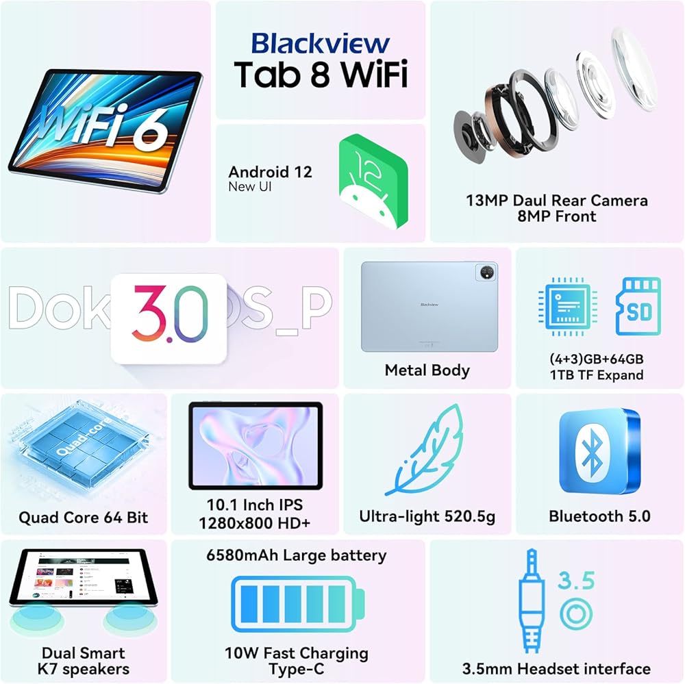 يحتوي جهاز Blackview Tablet Android 12 Tab 8 WiFi على منفذ USB من النوع C سهل الاستخدام ومقبس سماعة رأس مقاس 3.5 ملم لتلبية جميع احتياجاتك. بالإضافة إلى ذلك، مع شهادة GMS، يمكنك بسهولة تنزيل التطبيقات التي تحتاجها من متجر Google Play. كهدية لأصدقائك وأطفالك وكبار السن للمشاركة والاستمتاع، نقدم ضمانًا لمدة عامين على الجهاز اللوحي.