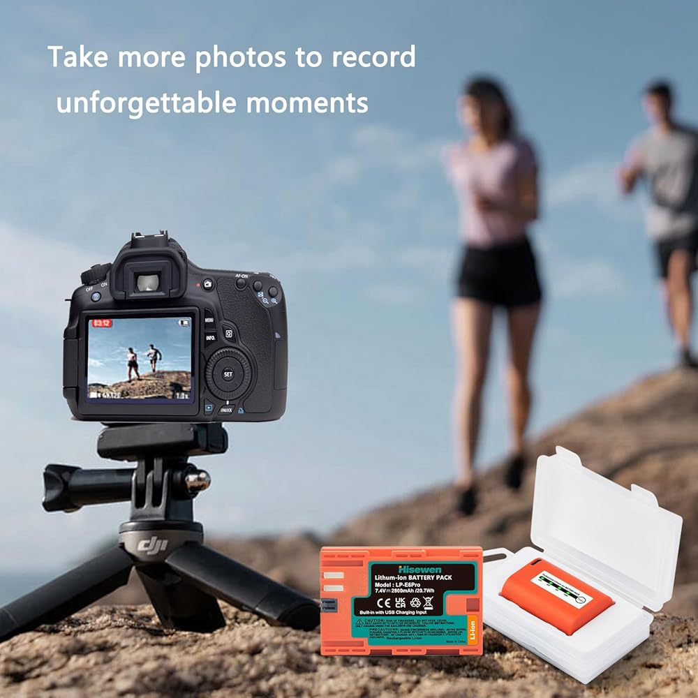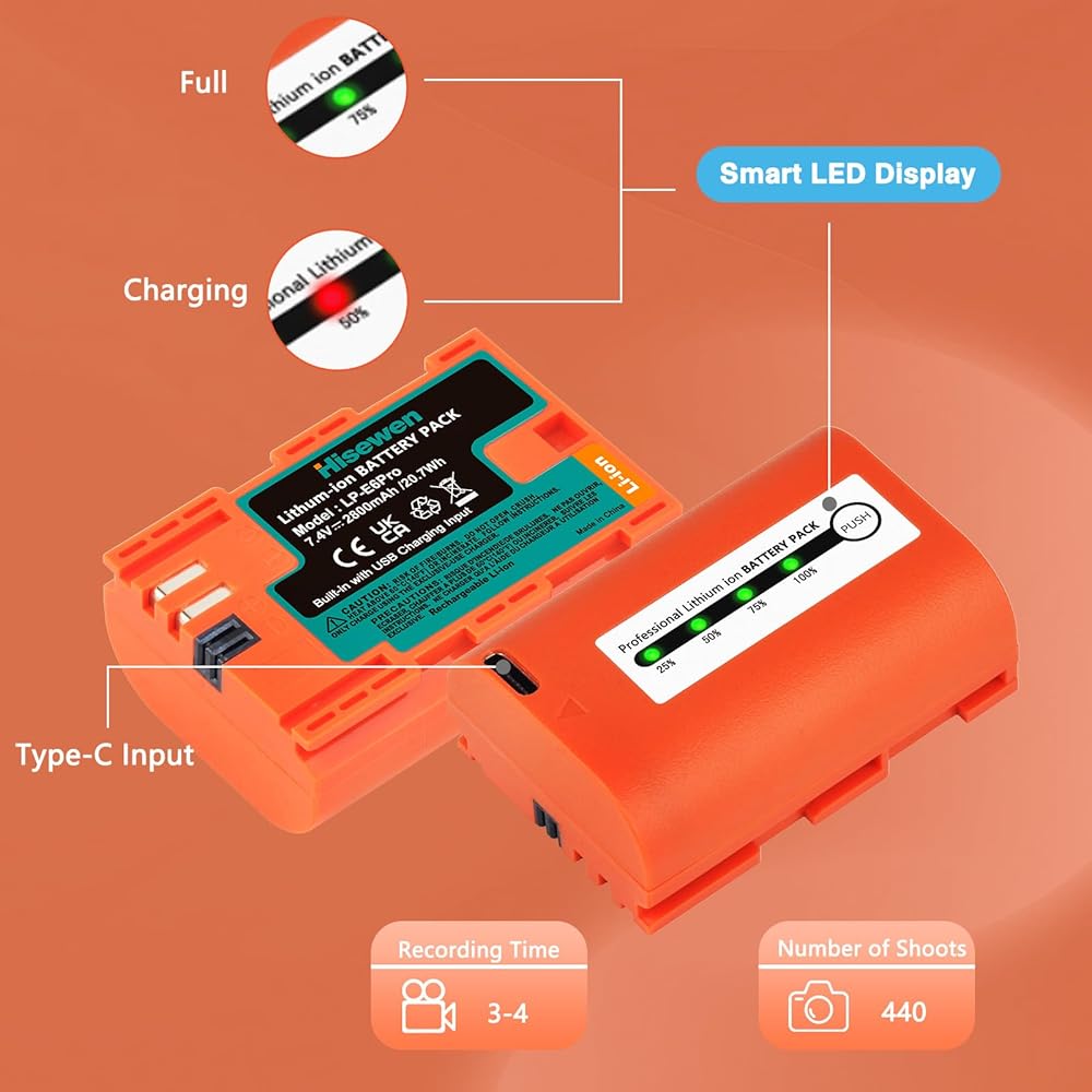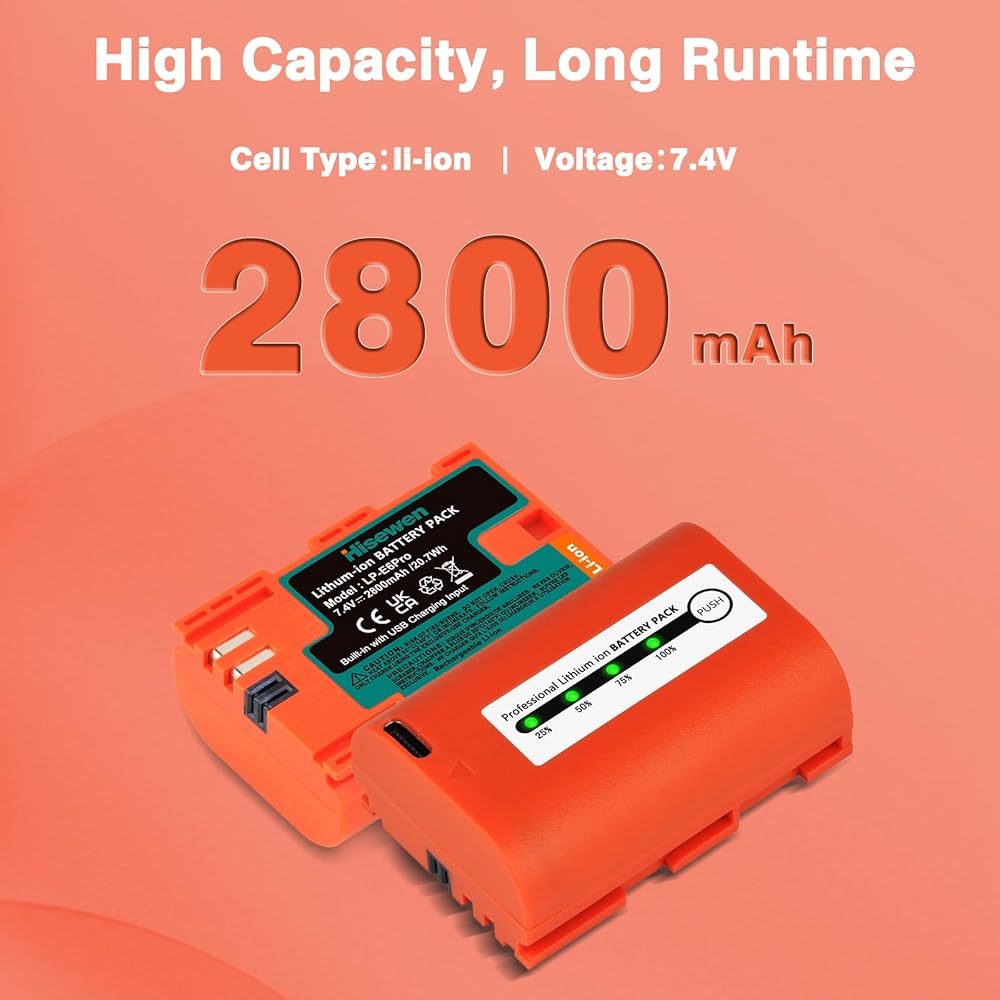 【LED Display & Easy Charging】Smart LED indicator shows the charging status of battery; The Hisewen LP-E6NH Battery can be charged via USB wall charger, camera charger, power bank or car charger.