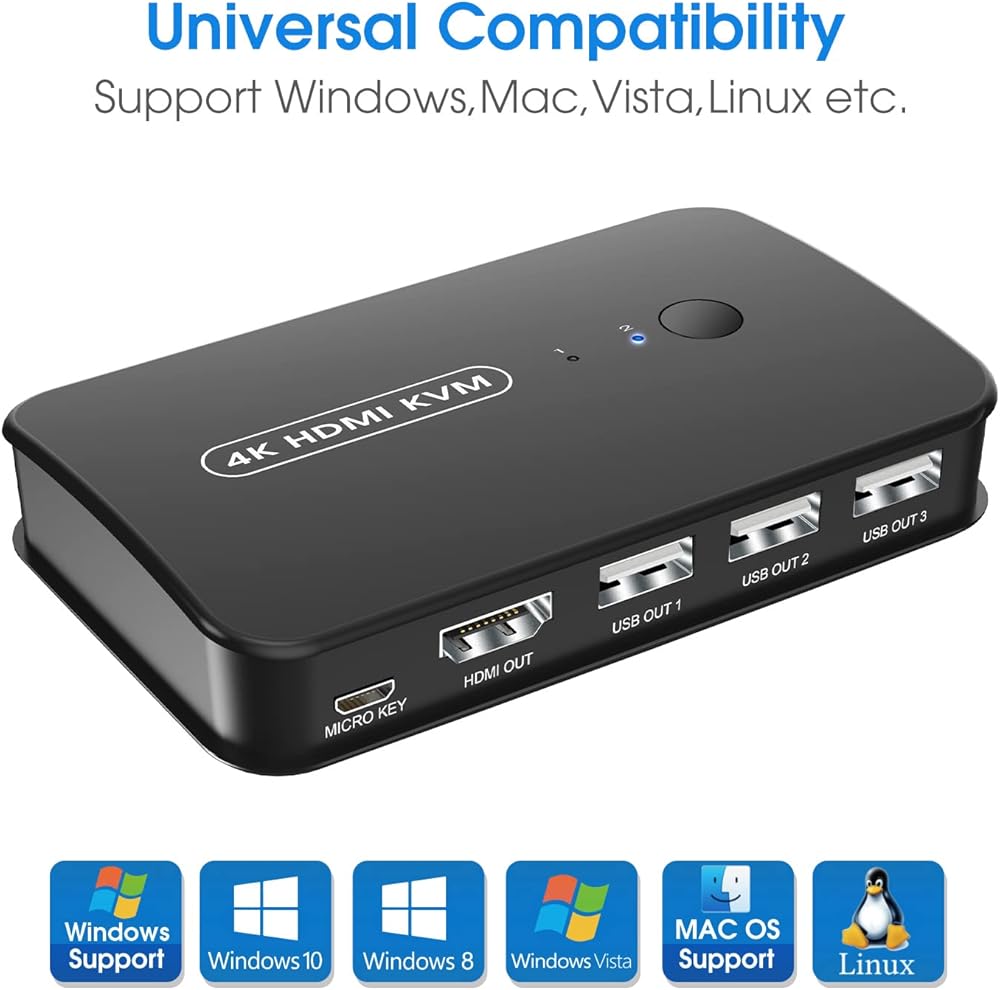 HDMI KVM switch 2 PC allows you to manage 2 computers by only 1 set of monitor + USB/wireless keyboard & mouse, and share 1 printer, U disk, USB speaker (only single USB cable) or other USB 2.0 devices.
