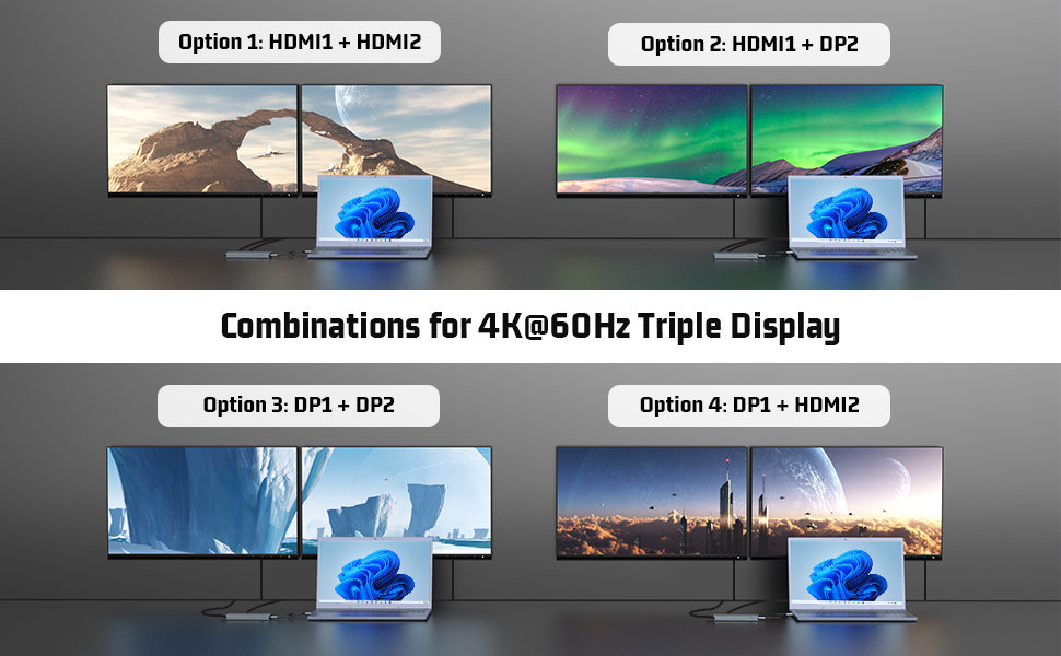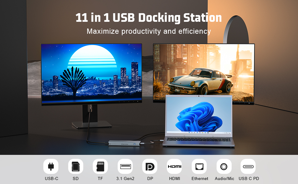 قاعدة توصيل 11 في 1، USB C HUB Dual 4K@60 هرتز، شاشة مزدوجة لمخرجات الفيديو، (3 USB 3.1 10 جيجابت/ثانية، 2 HDMI، 2 DP، 100W PD، 1000 ميجابت في الثانية إيثرنت وصوت) لأجهزة Windows وM1 Macs