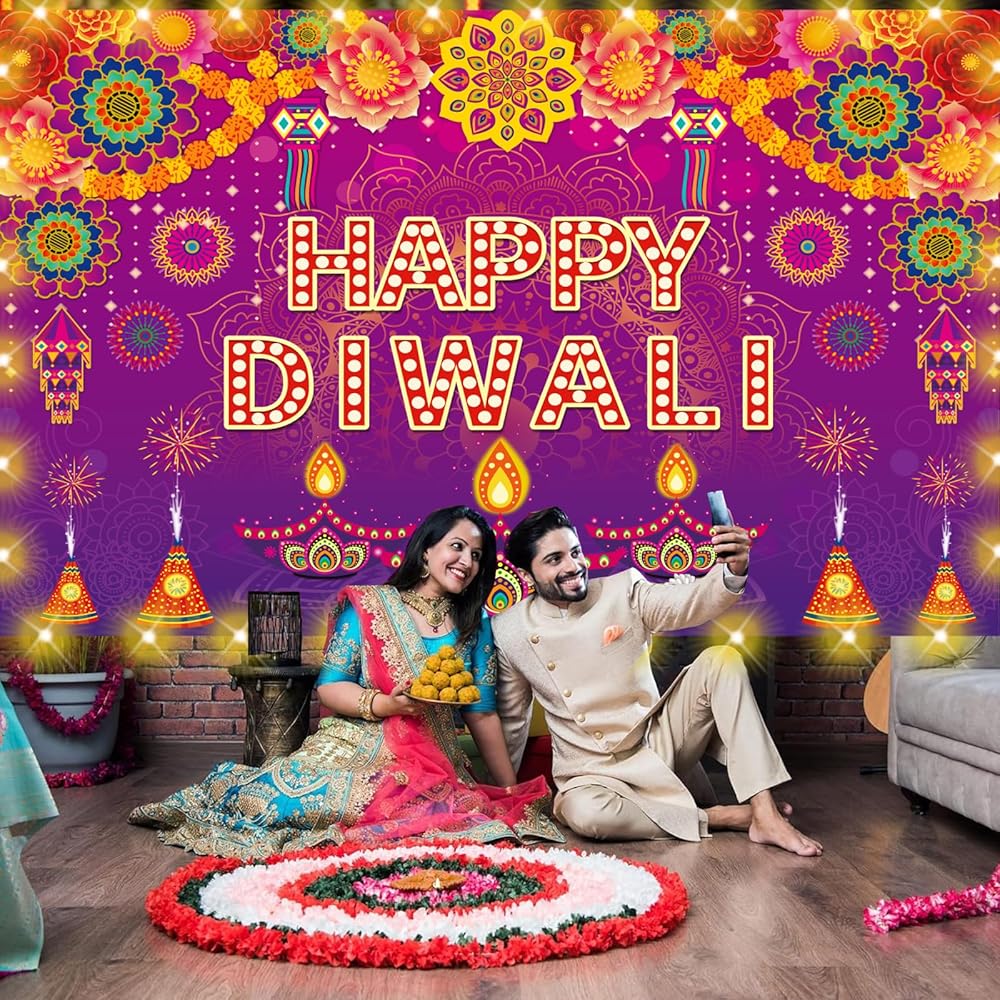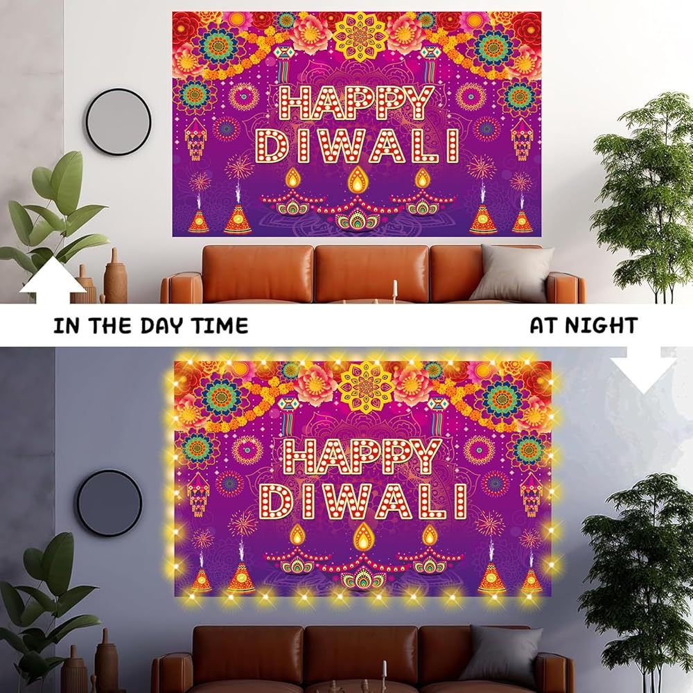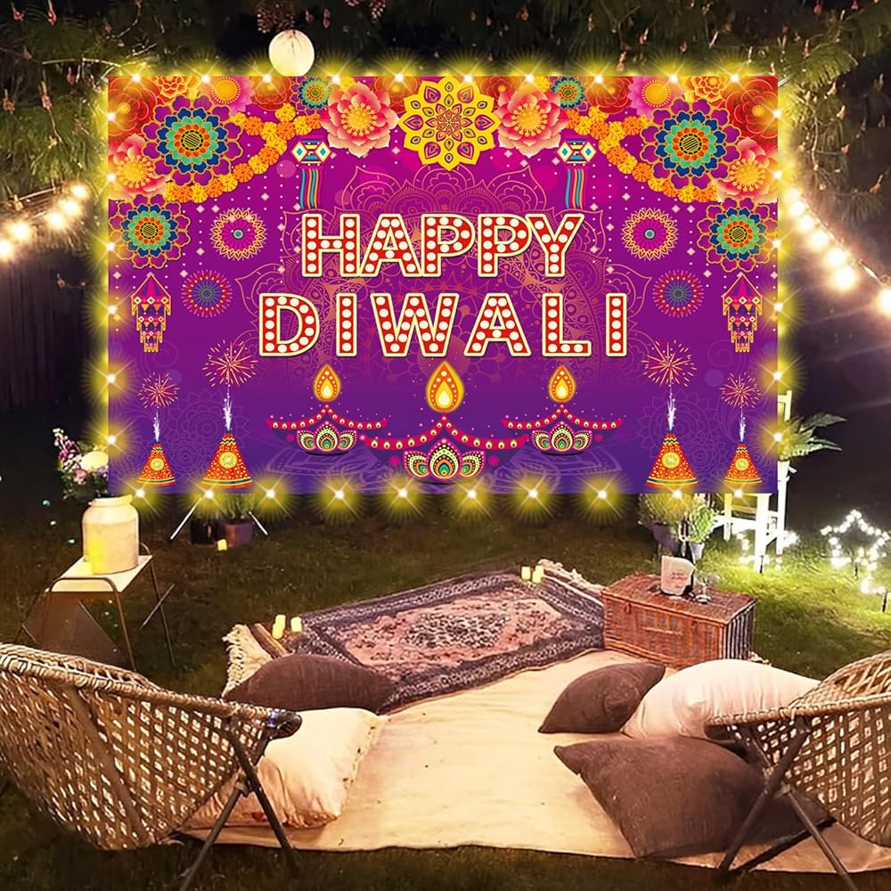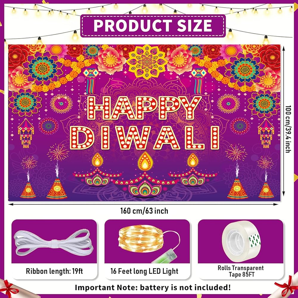 Convenient Diwali Party Supplies - Happy Diwali decoration backdrop banner comes along with 19m long ribbon, easy to hang on through the copper grommet! Happy Diwali backdrop banner can be hang on wall, window, branches of tree, ceiling, archway, doorway or any other place as a Happy Diwali welcome sign!
