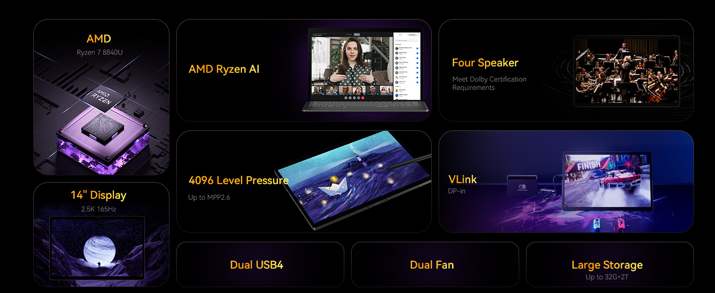 واجهات غنية: يأتي هذا الجهاز اللوحي V3 مزودًا بمنفذ 4xUSB4 (حتى 40 جيجابت في الثانية)، ومنفذ 1xV-Link(DP IN)، وفتحة بطاقة 1xSD، ومقبس صوت 1x. الوزن 940 جرام فقط والسمك 9.8 ملم فقط.