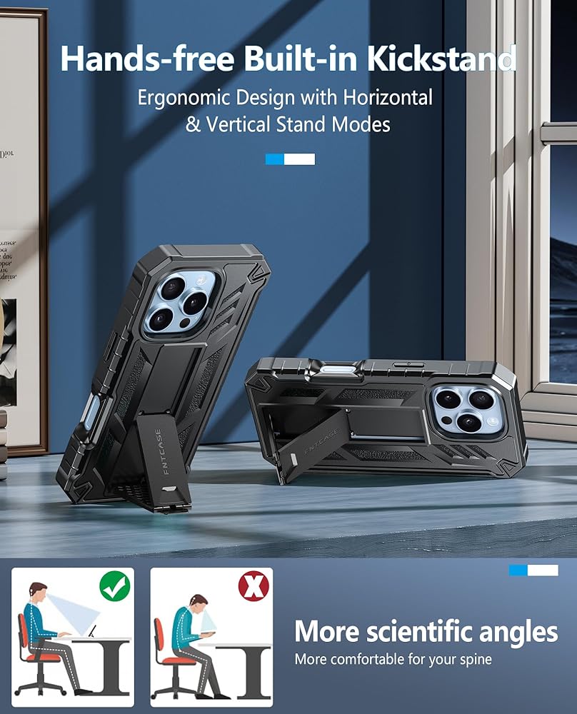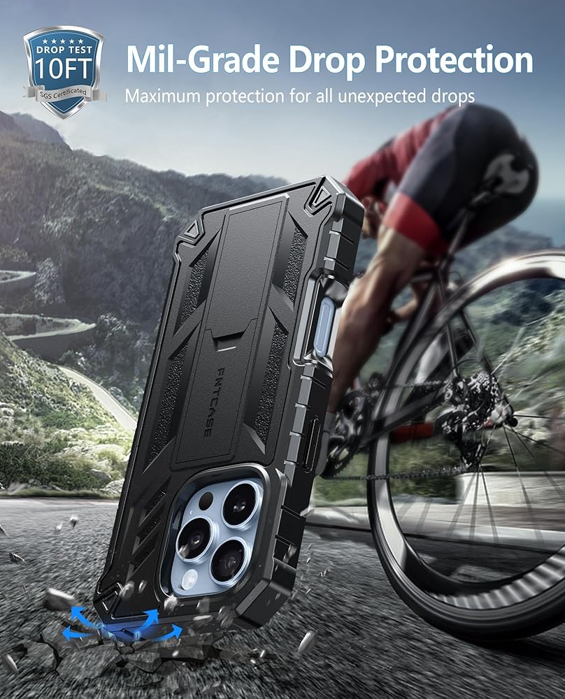 حافظة FNTCASE لهاتف iPhone 16 Pro: غطاء هاتف محمول للحماية من السقوط من الدرجة العسكرية مع مسند | ملمس متين ومقاوم للصدمات من مادة TPU | حافظة هاتف متينة وواقية - 6.3 بوصة باللون الأسود