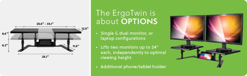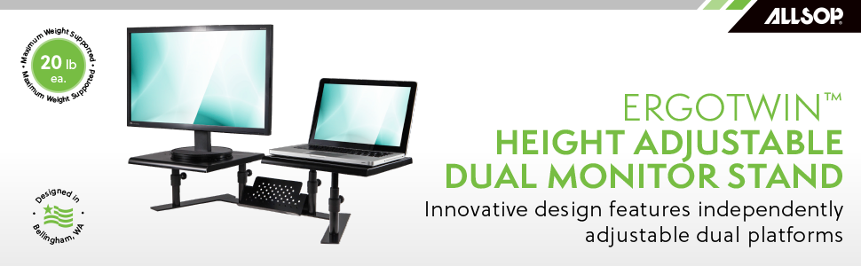 Dual-monitor platforms are independently adjustable for optimum flexibility in configuring your desktop and platforms can be positioned together as a shelf. Design supports proper ergonomics for viewing screens. Easily adjust laptop height to match monitor height with a 2-3/10" range from 6-1/10" to 8-2/5". The 12-3/4" x 12-3/4" platforms also include an integrated phone/tablet holder. Made from powder-coated welded steel, this ergonomic stand provides a sturdy shelf for your laptop, monitor and/or printer. Perforated hole pattern in the steel provides passive airflow to keep your electronics cool. The space beneath the platforms provides a place for your keyboard or other office supplies and electronics so you can keep them out of the way when not in use. Six nonslip foam rubber pads protect your desk surface. Each platform holds up to 20 lb.