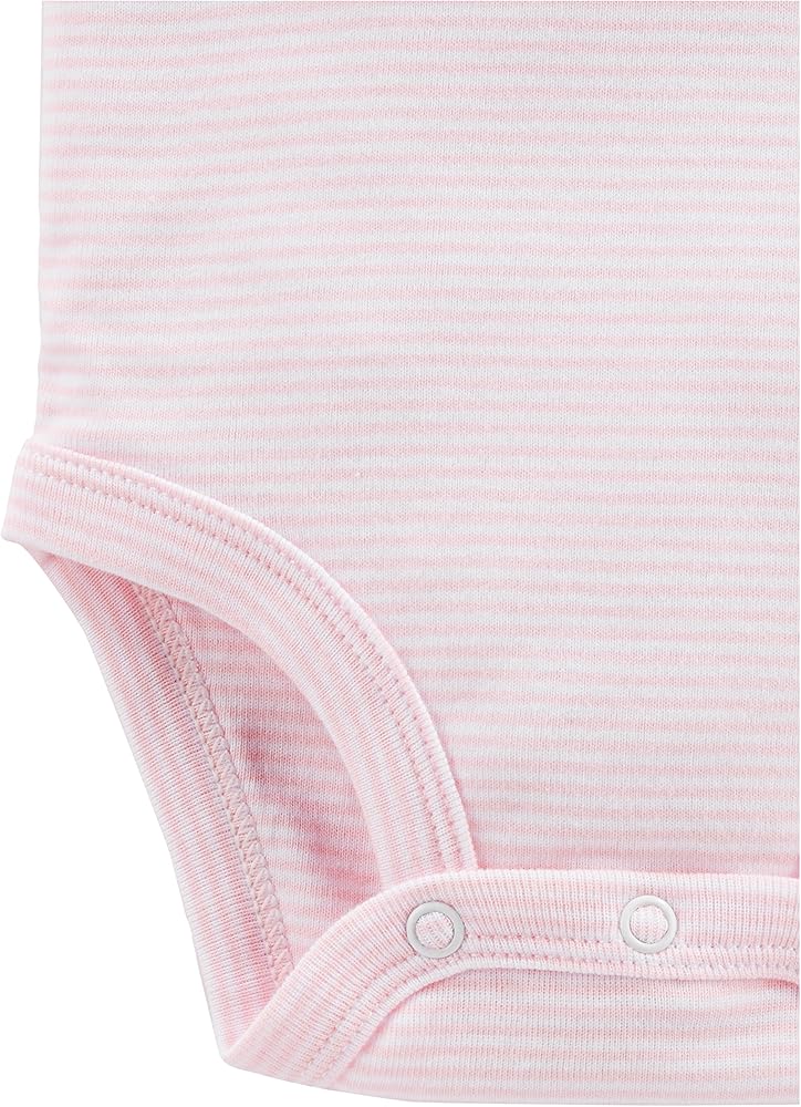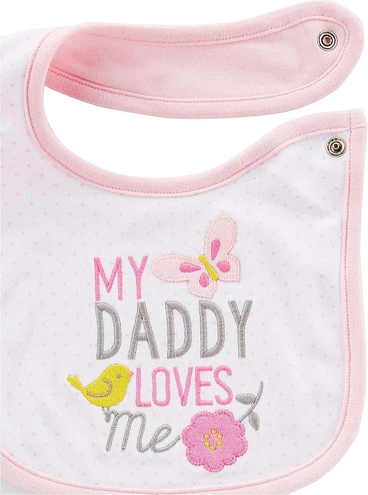 This Carter's four-piece set in soft cotton features a short-sleeve bodysuit, footed pants, waterproof bib, and coordinating cap.