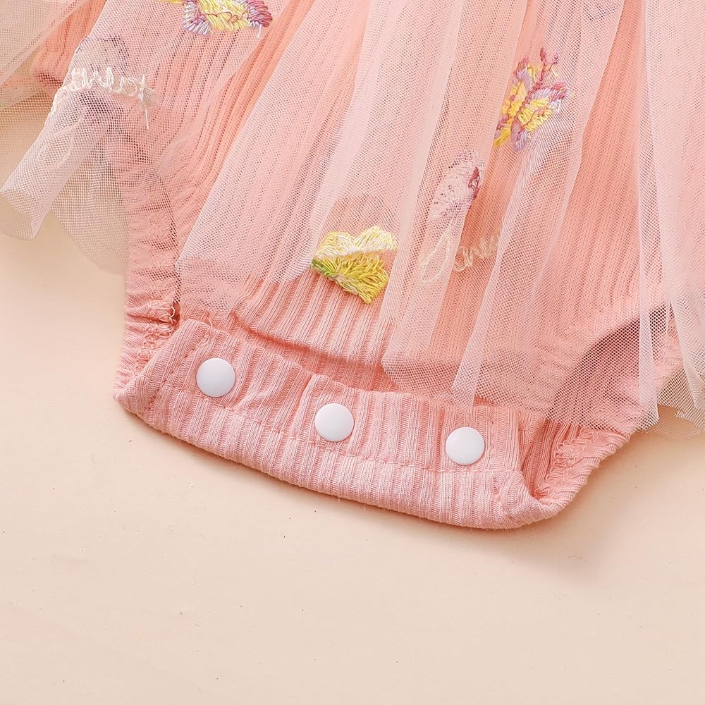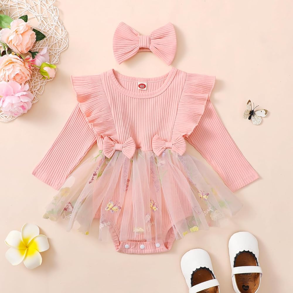 CASUAL DESIGN: Baby girl long sleeve romper, baby girl romper dress, floral mesh patchwork, cute bow, round neckline, ruffles, long sleeves, buttons at the bottom, and cute headband set, simple but fashionable, make your baby more adorable.