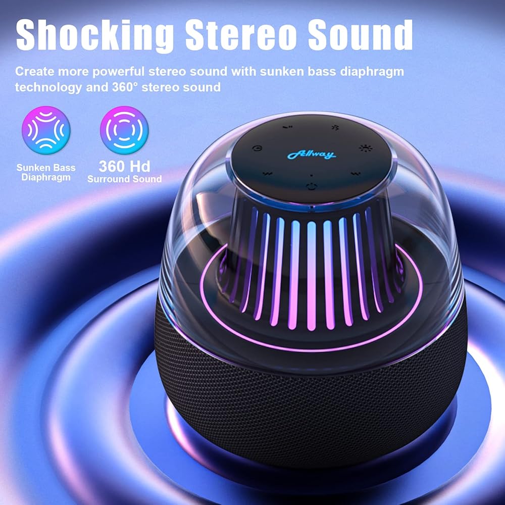 مكبرات صوت بلوتوث LED من ALLWAY، 8 أوضاع إضاءة، صوت جهير فائق وصوت عالي الدقة 360 درجة، التحكم في التطبيق، ميكروفون مدمج للمكالمات السهلة، مكبرات صوت بلوتوث 5.3، اقتران TWS للمنزل والحفلات والتخييم والسفر
