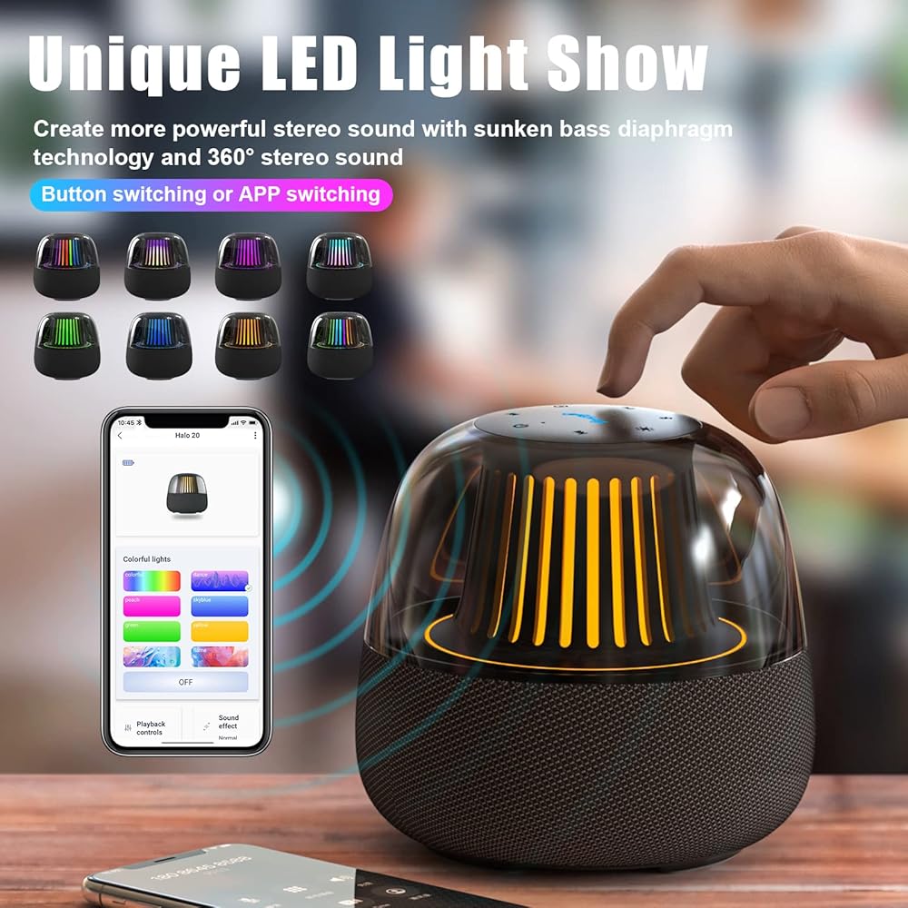 عرض ضوء LED فريد من نوعه، يأتي مكبر الصوت LED بتقنية البلوتوث مع 3 أوضاع و8 تأثيرات إضاءة، بما في ذلك ضوء التنفس RGB مع لون واحد ومتعدد الألوان، ونبض إيقاعي، وتدفق ديناميكي ملون ولهب ناري. يمكن تبديل الإضاءة الملونة بسهولة باستخدام التطبيق الحصري، والذي يسمح لك بإنشاء بيئة مخصصة وقتما تشاء.
