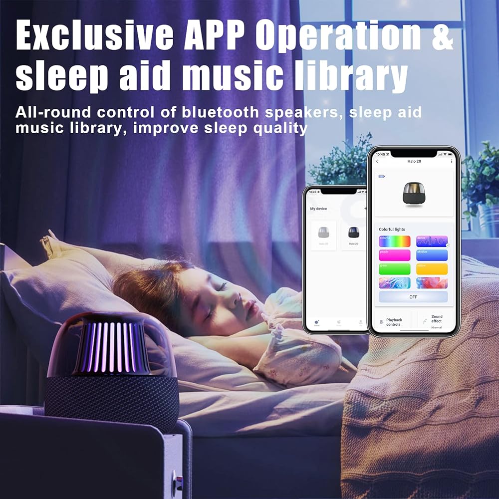 تشغيل التطبيق الحصري تأتي مكبرات الصوت البلوتوث هذه مع تطبيق Allway الحصري للتشغيل الشامل، بما في ذلك تعديل مستوى الصوت والإضاءة والمؤثرات الصوتية؛ يتميز تطبيق Allway بمكتبة موسيقية للنوم العميق، ويقدم رذاذًا ناعمًا مريحًا لقضاء ليلة من النوم الطويل.