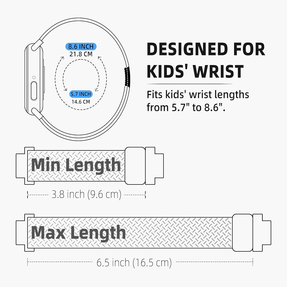 سهل التعديل: السوار قابل للتعديل من 8.8 سم إلى 6.5 سم، ويناسب أطوال معصم الأطفال التي تتراوح بين 13.9 سم إلى 8.5 سم. لذلك، حتى لو كان لدى أطفالك أطوال مختلفة للمعصمين، فيمكنهم جميعًا ارتدائها إذا أحبوا ذلك.