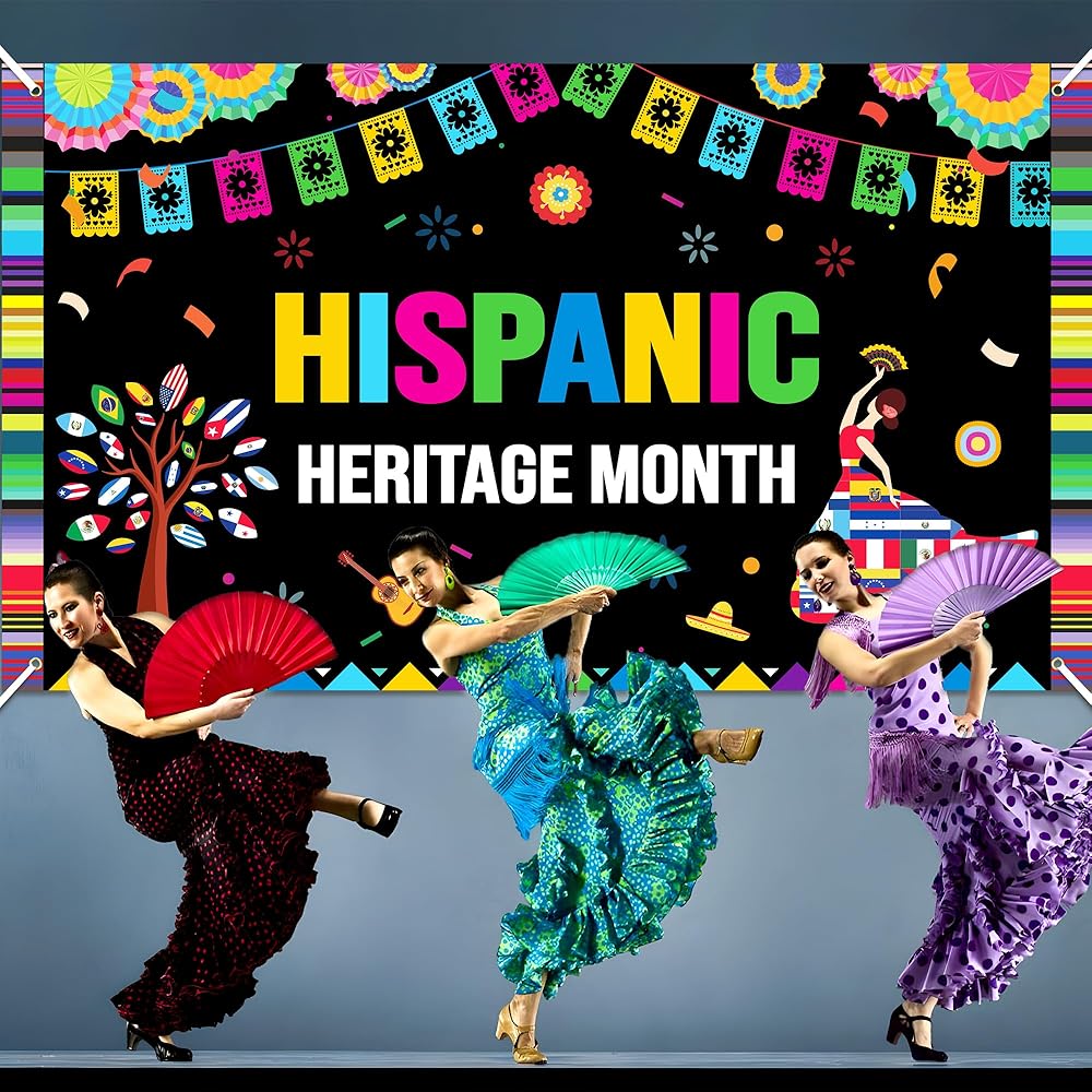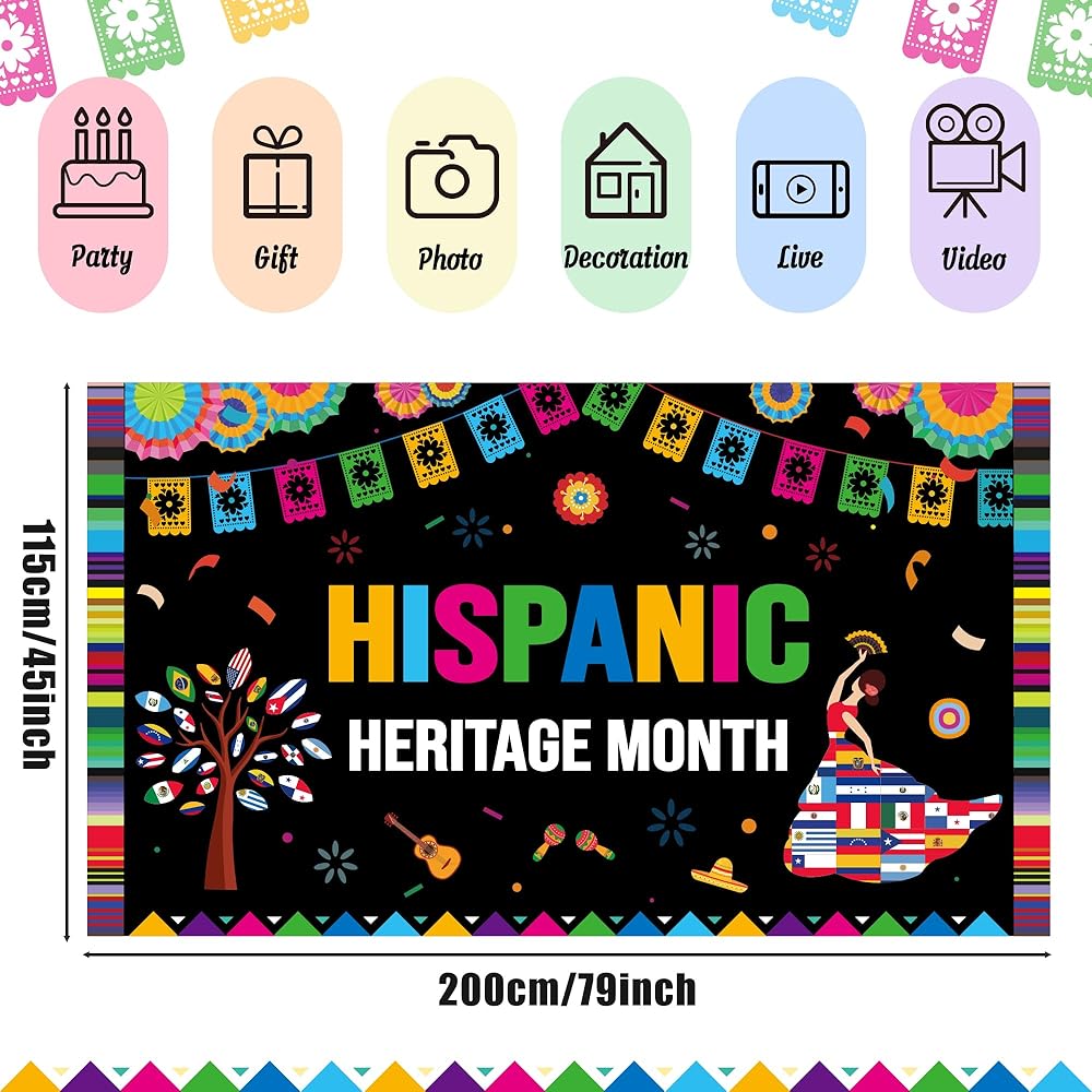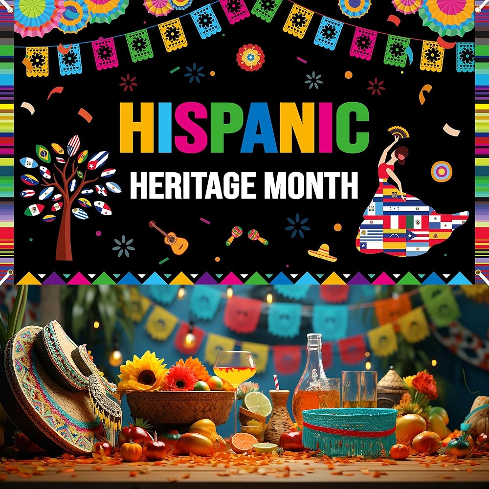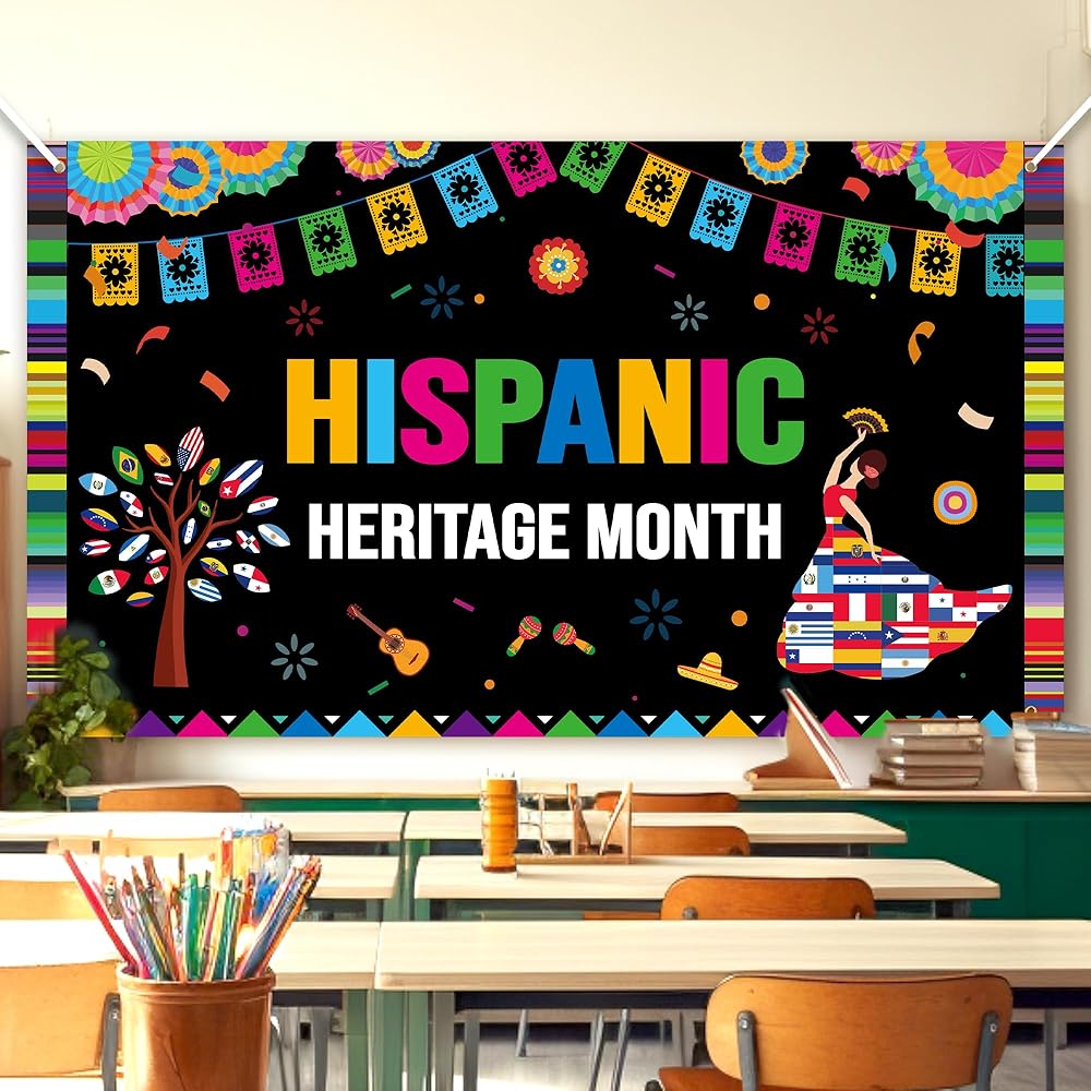 العناصر التعليمية: لافتة ديكورات شهر التراث الإسباني ذات ألوان زاهية وتصميم مع العديد من عناصر الاحتفال بشهر التراث الإسباني مثل الموسيقى التقليدية والرقص، وأعلام دول أمريكا اللاتينية، والزهور، والمفرقعات النارية، والجيتار، مما يخلق مشهدًا من احتفالات شهر التراث الإسباني السعيدة والحيوية!