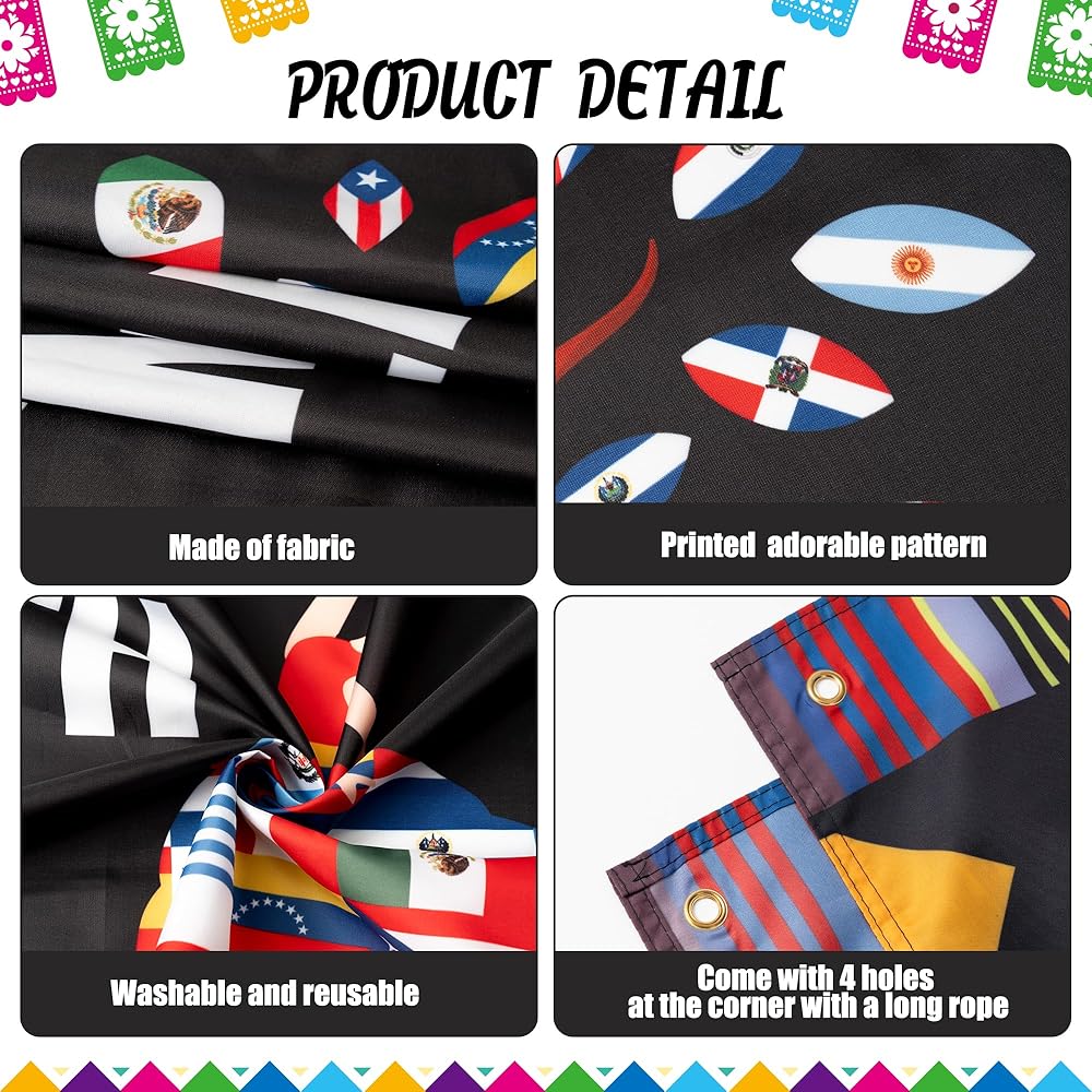 زينة اللافتة الإسبانية: تتضمن العبوة قطعة واحدة من لافتة قماش شهر التراث الوطني الإسباني وقطعة واحدة من الحبل الأبيض. مقاس العلم 78.7 × 45.2 بوصة (200 × 115 سم). إنها كبيرة بما يكفي لتناسب أي حفلات ذات طابع شهر التراث الإسباني، وحفلات الانتقال إلى منزل جديد، وتلبي معظم متطلبات الصور.