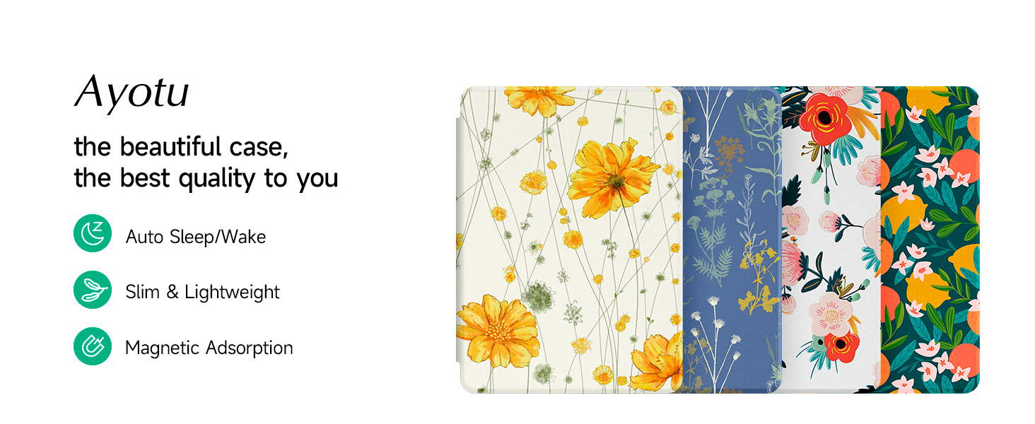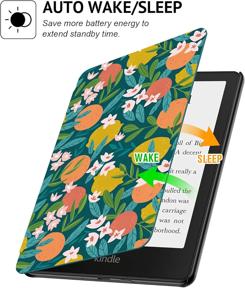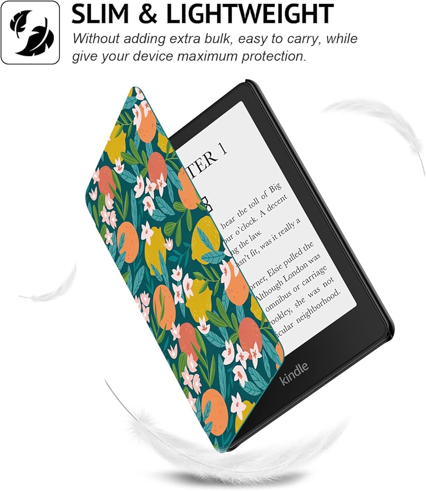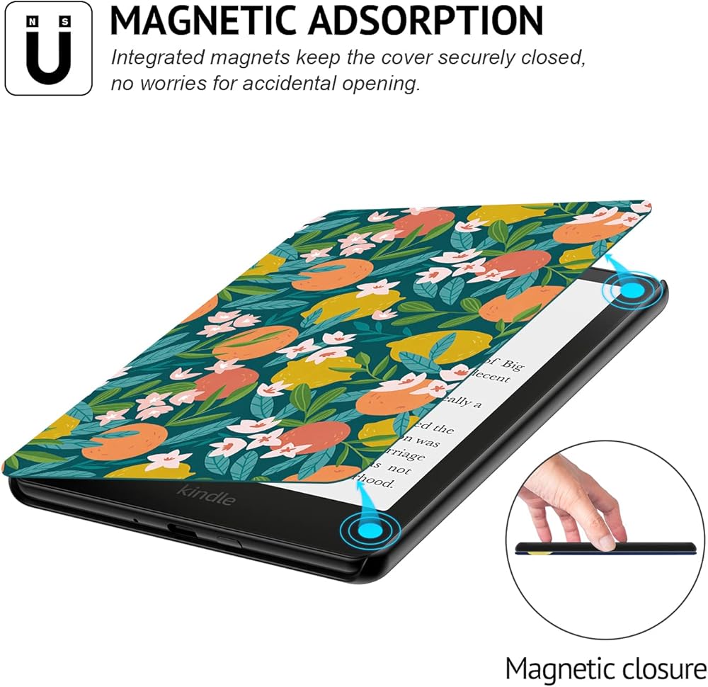 حافظة Ayotu لجهاز Kindle Paperwhite الجديد مقاس 6.8 بوصات (الجيل الحادي عشر - إصدار 2021) - غطاء من جلد البولي يوريثان مع خاصية التنبيه/السكون التلقائي - يناسب إصدار Amazon Kindle Paperwhite Signature، الزهور والفواكه