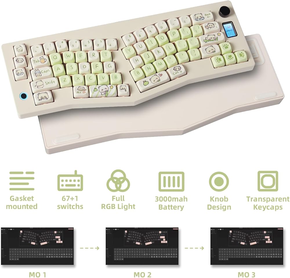 【سلك من النوع C، بلوتوث، 2.4 جيجا】تدعم لوحة المفاتيح ABM066 Alice تقنية البلوتوث، واتصال 2.4 جيجا لاسلكي وسلك USB-C ثلاثي الأوضاع. يمكنك توصيل لوحة المفاتيح بجهازك بسهولة باستخدام كابل سلكي من النوع C واتصال بلوتوث لاسلكي. . يمكن توصيل ما يصل إلى 3 أجهزة في الوضع اللاسلكي ويمكنك تبديل الأجهزة بسهولة بالضغط على Fn+Z، X، C.