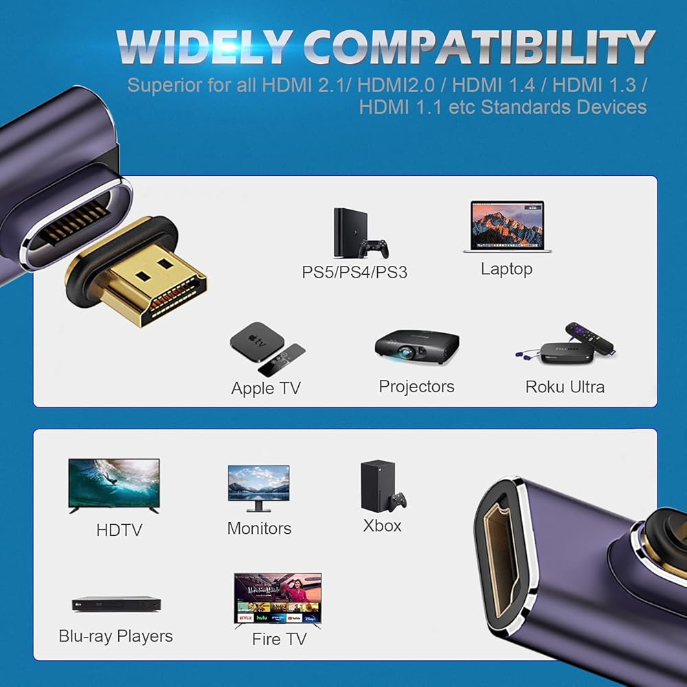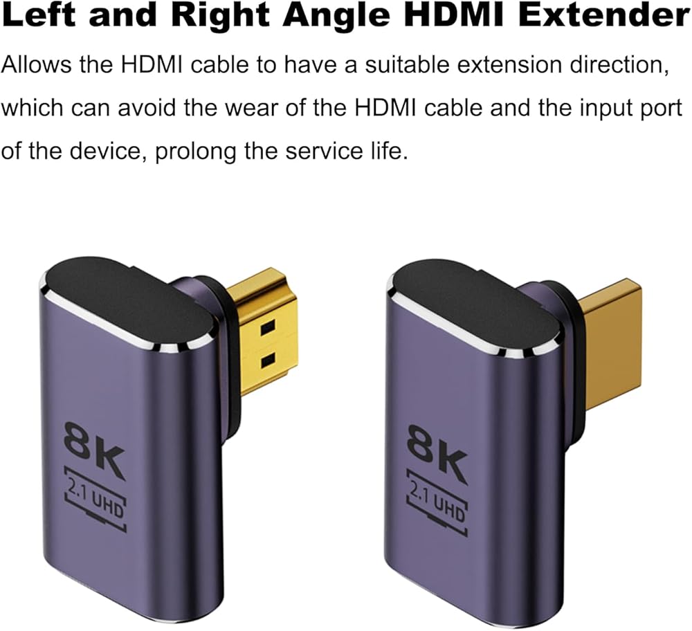 【90 and 270 Degree Design】The adapter with different angle(Left&Right angle) allows the HDMI cable to have a suitable extension direction, which can avoid the wear of the HDMI cable and the input port of the device, prolong the service life.