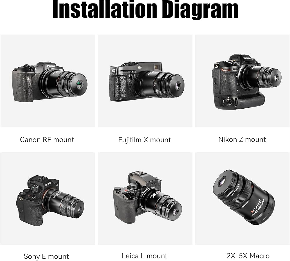 توافق متعدد الاستخدامات: تم تصميم عدسة AstrHori مقاس 25 مم f/2.8 بدقة للكاميرات ذات الإطار الكامل بدون مرآة، مما يضمن التوافق السلس مع موديلات APS-C. يوفر هذا التنوع للمستخدمين طولًا بؤريًا يعادل 37.5 ملم، مما يلبي مجموعة واسعة من أنظمة الكاميرا.
