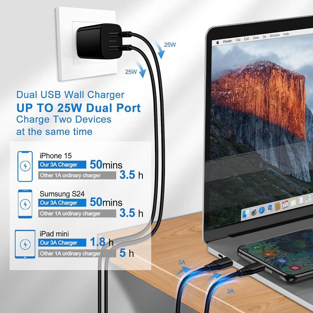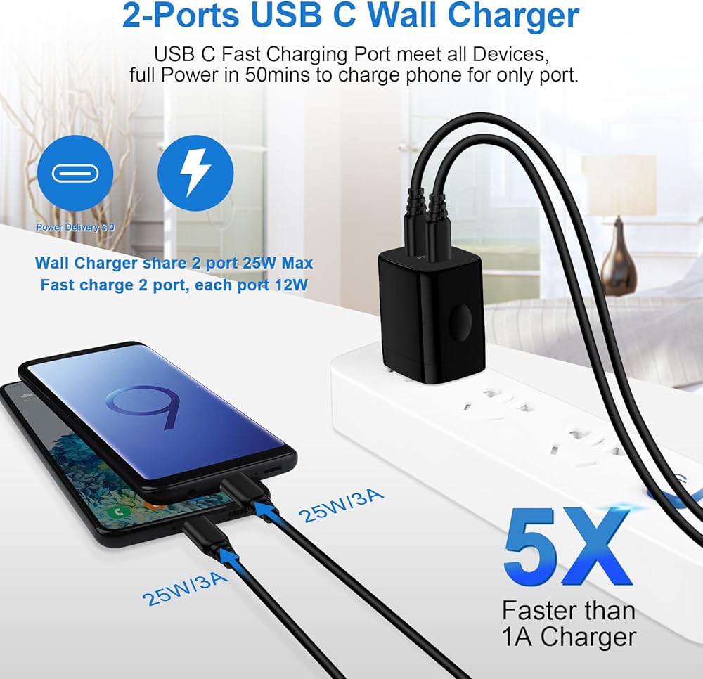 • 【25W Super Fast iPhone 15 Charger Block】: With super fast charging PD3.0 PPS and QC3.0 technology, fast iphone 15 charger block supports 25w super fast charging for LG, Samsung, Motorola, Google Pixel, iPhone, charging samsung s24 from 0% to 70% in just 30mins, 100% charging in 50 minutes, 5X faster than 5W/1A samsung phone charger cube. Two ports share 25W/4.8A. Just charging a USB C port, reach up to 25W/4.8A. Two ports charging together, each one 12W/2.4A.