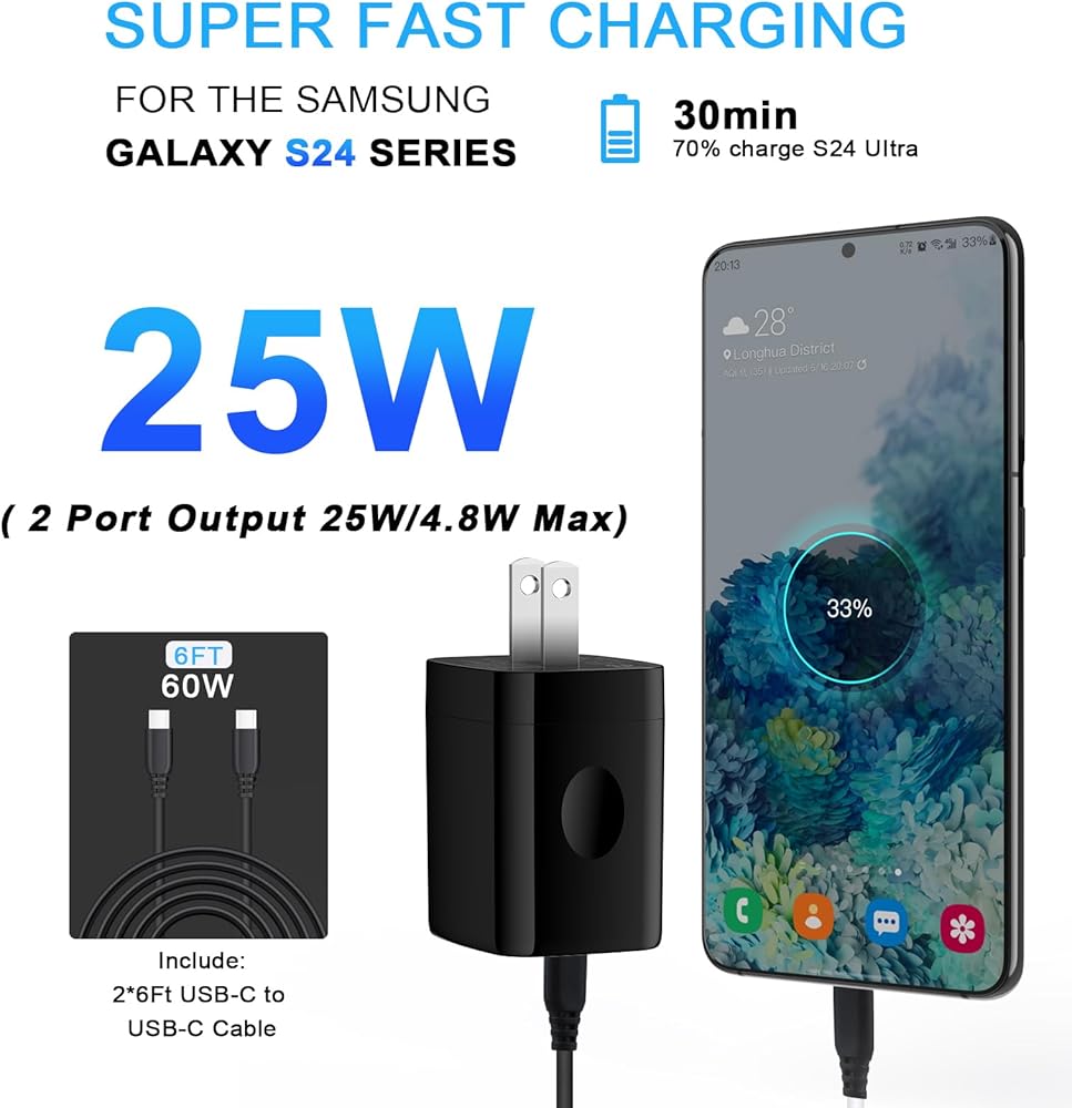 25w super fast samsung android phone charger provides you max 25W output power, charging samsung galaxy s24 up to 70% in just 30 minutes, full charging in only 50mins.