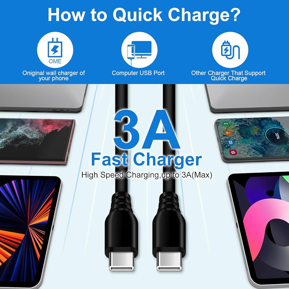 • 【6FT 60W Type C to C Cable】: 6FT USB C to USB C samsung s24 charging cord combined with 25W samsung super fast charger let you can transfer data speed up to 480Mb/s, friendly reversible usb-c port design, Rapid Charging at 3A Maximum. Use 60W samsung tablet charger cord also charges your laptop, but need a above 30w USB C Fast Charger Adapter.