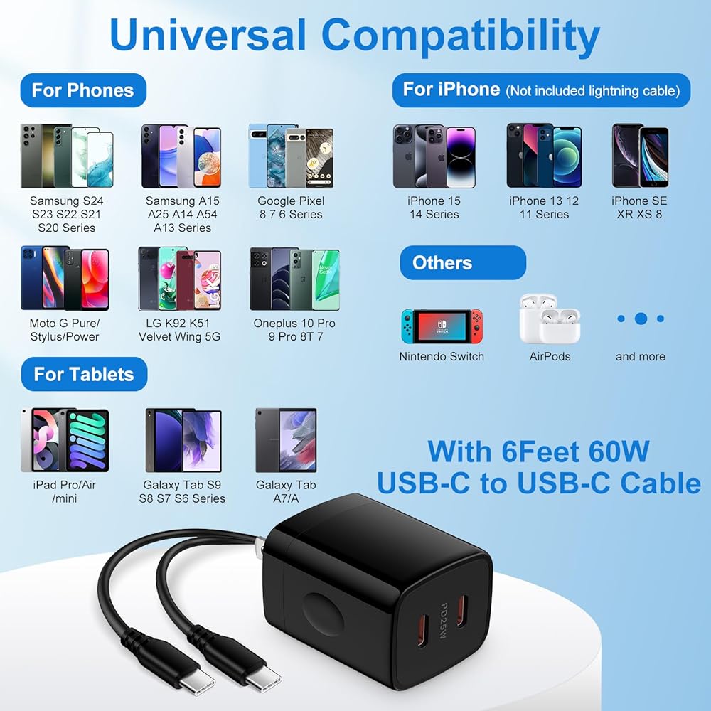 شاحن سريع، 25 وات USB C 2 منفذ شاحن حائط كتلة شحن سريع سلك شاحن أندرويد 6 أقدام لهاتف iPhone 15/15 Pro/15 Plus/15 Pro Max، Samsung Galaxy S24 Ultra S23 FE A15 A54 A14 A25 A23 A03s S22 S21 A53