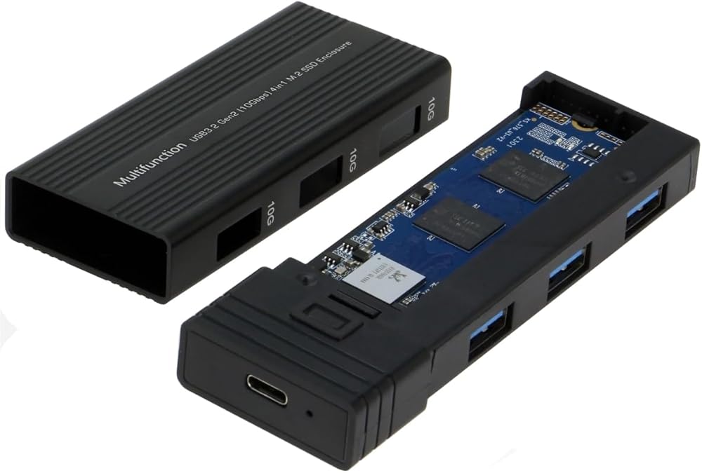 2 in 1 design : Enclosure for m.2 PCIe nvme SSD / 3 Port USB 3.2 Gen II type A Hub USB 3.2 Gen II ( 10 Gbps ) specification 10 Gbps fast and stable Compatible with M.2 NVMe & M.2 SATA PCle SSD with M-key, B&M key