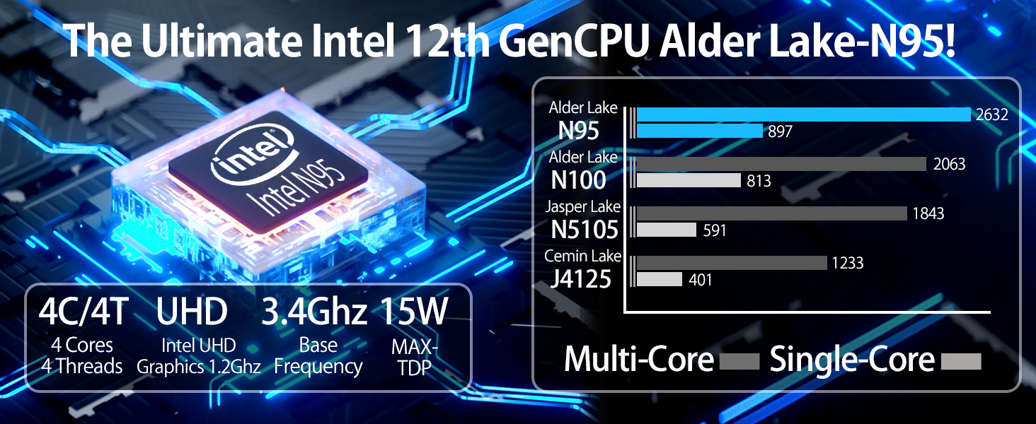 أحدث معالجات Intel N95 من الجيل الثاني عشر لعام 2023 - هذا الكمبيوتر الصغير MP60 المُطوَّر مدعوم بمعالج Intel Alder Lake رباعي النواة N95 من الجيل الثاني عشر (يصل إلى 3.4 جيجا هرتز). أداء N95 (Intel 7) أعلى بنسبة 40% من N5105/ N5095/N5100/N100/J4125. سيكون هذا الكمبيوتر الصغير أكثر قوة، ويوفر سرعة وكفاءة أكبر، مما يخلق تجربة سلسة للغاية للترفيه المنزلي المرئي، وبث الفيديو، والعمل، والألعاب.