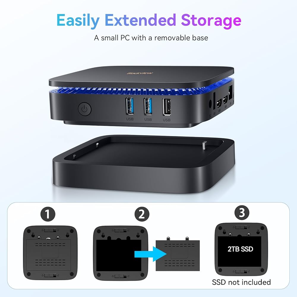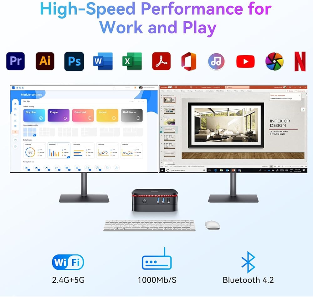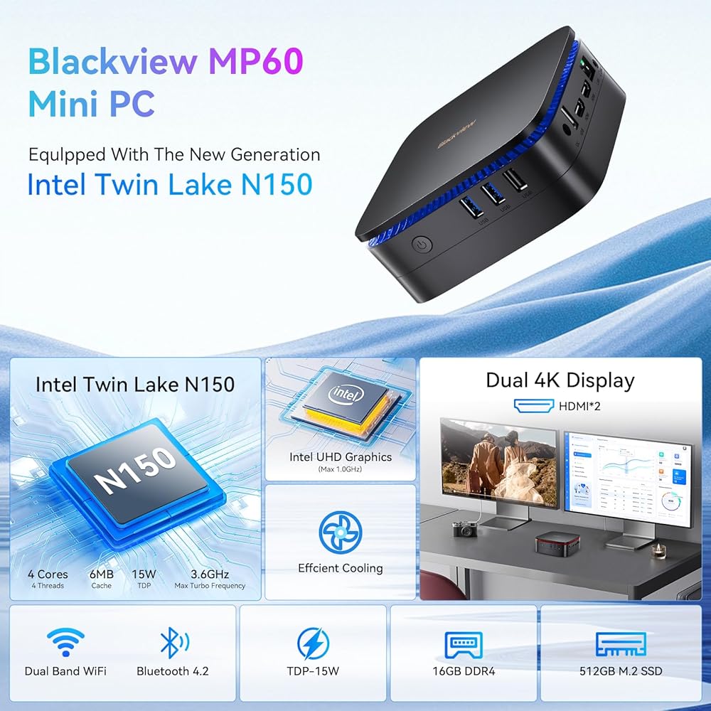 شاشة عرض مزدوجة 4K@60 هرتز - الكمبيوتر الصغير مجهز برسومات Intel UHD مؤهلة لدعم 4K@60 هرتز، مما يوفر لك تجربة فيديو أكثر وضوحًا وسلاسة. تتيح لك إمكانية العرض المزدوج بدقة 4K HDMI توصيل شاشتين في نفس الوقت، مما يسمح لك بالعمل بكفاءة أكبر. يأتي Blackview MP60 مع ضمان لمدة 3 سنوات وخدمة عملاء كاملة على مدار الساعة طوال أيام الأسبوع.