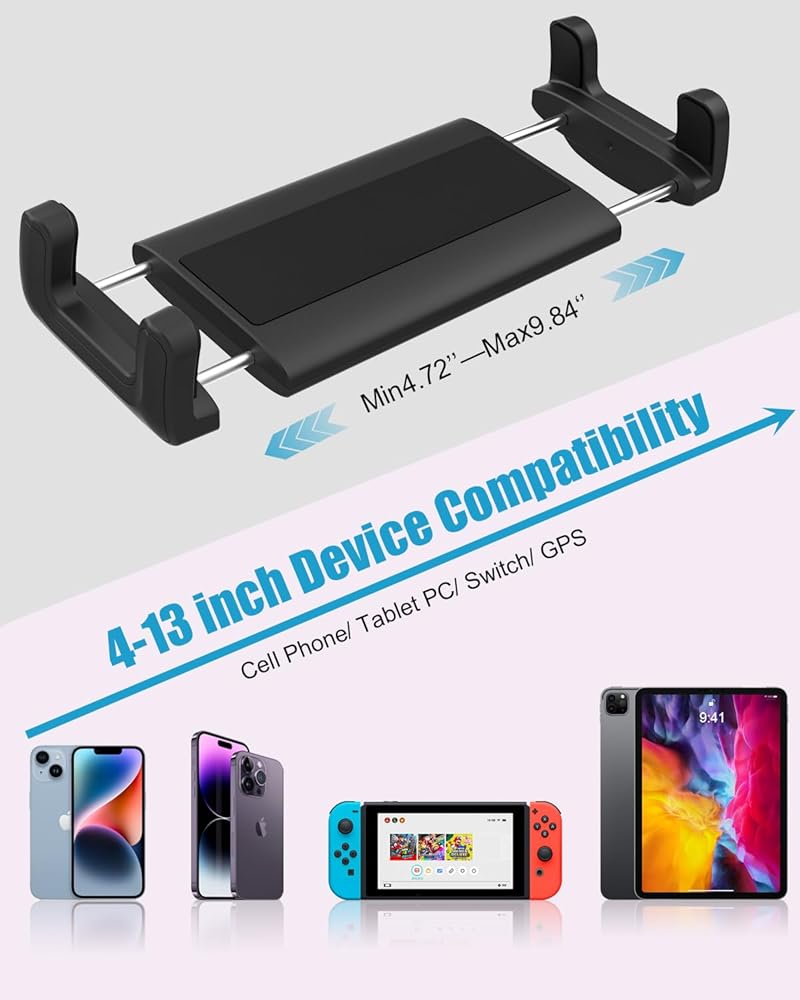 【توافق واسع】حامل الكمبيوتر اللوحي هذا بين مقاعد السيارة، تمتد المشابك الجانبية القابلة للتعديل من 4.7 بوصة إلى 10.2 بوصة، متوافق مع جميع الهواتف الذكية والأجهزة اللوحية مقاس 4 - 13 بوصة، مثل iPad Pro 9.7 / 10.5 / 11 / 12.9، iPad Air الجديد 2، إير 3، إير 4، آيباد ميني 1/ 2 / 3 / 4 / 5، آيفون 13، 13 برو، 13 برو ماكس، آيفون SE، آيفون 12، 12 برو، 12 برو ماكس، آيفون 11، XS، XS Max ، XR، X، 8 Plus، 8، 7، 7 Plus، 6 Plus، 6، Galaxy Tab/ Galaxy Note/ Galaxy S والمزيد من الهواتف المحمولة أو الأجهزة.