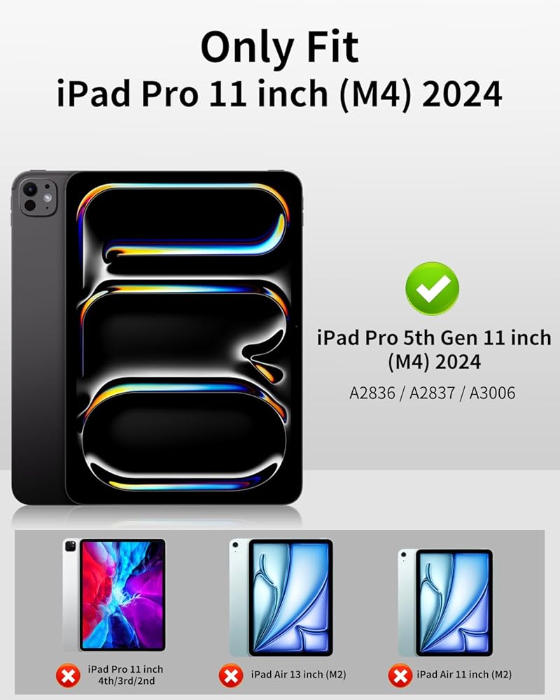 • 【نموذج التوافق】تم تصميم حافظة iPad هذه لجهاز iPad Pro 11 بوصة (الجيل الخامس، 2024) الموديل: A2836/A2837/A3006). غير متوافقة مع أي موديلات iPad أخرى. يرجى التحقق من الجزء الخلفي لجهاز iPad الخاص بك للعثور على رقم الطراز قبل تقديم الطلب.