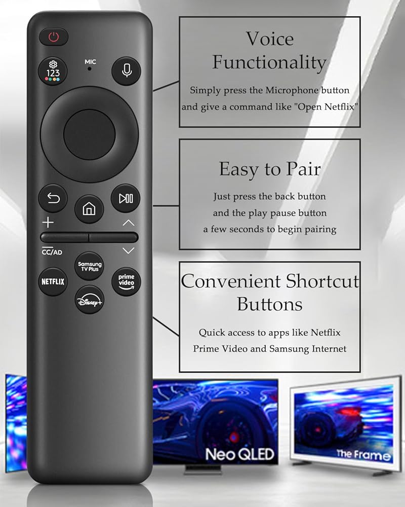 𝐕𝐨𝐢𝐜𝐞 𝐂𝐨𝐧𝐭𝐫𝐨𝐥: BN5901432A / TM2360E 2023 SMART. بفضل وظيفة البحث الصوتي، يتيح لك جهاز التحكم عن بعد هذا تنفيذ الأوامر دون عناء بضغطة زر واحدة، مما يجعله إضافة ممتازة لأي نظام ترفيه منزلي.