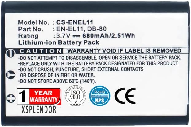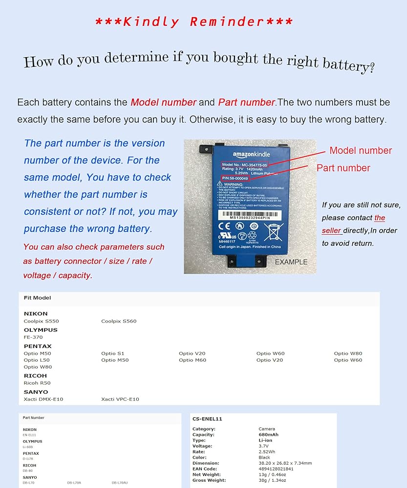 Fit Model NIKON Coolpix S550 Coolpix S560 OLYMPUS FE-370 PENTAX Optio M50 Optio S1 Optio V20 Optio W60 Optio W80 Optio L50 Optio M50 Optio M60 Optio V20 Optio W60 Optio W80 RICOH Ricoh R50 SANYO Xacti DMX-E10 Xacti VPC-E10 Part Number NIKON EN-EL11OLYMPUS Li-60B PENTAX D-Li78 RICOH DB-80 SANYO DB-L70 DB-L70A DB-L70AU Please ensure both model and battery part number are matched with your device before purchasing.