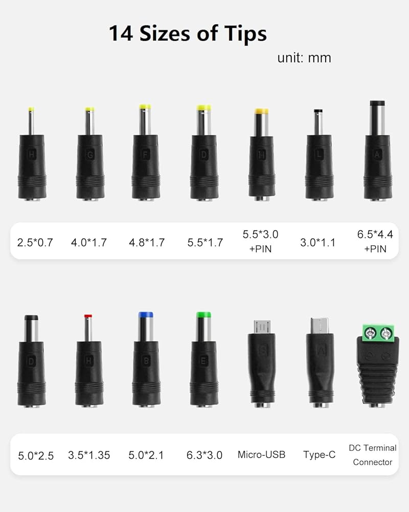 14 Tips:2.5x0.7mm, 4.0x1.7mm, 4.8x1.7mm, 5.5x1.7mm, 5.5x3.0mm+Pin, 3.0x1.1mm, 6.5x4.4mm+Pin, 5.0x2.5mm, 3.5x1.35mm, 5.0x2.1mm, 6.3x3.0mm, Micro-USB, Type-C, DC Terminal Connector