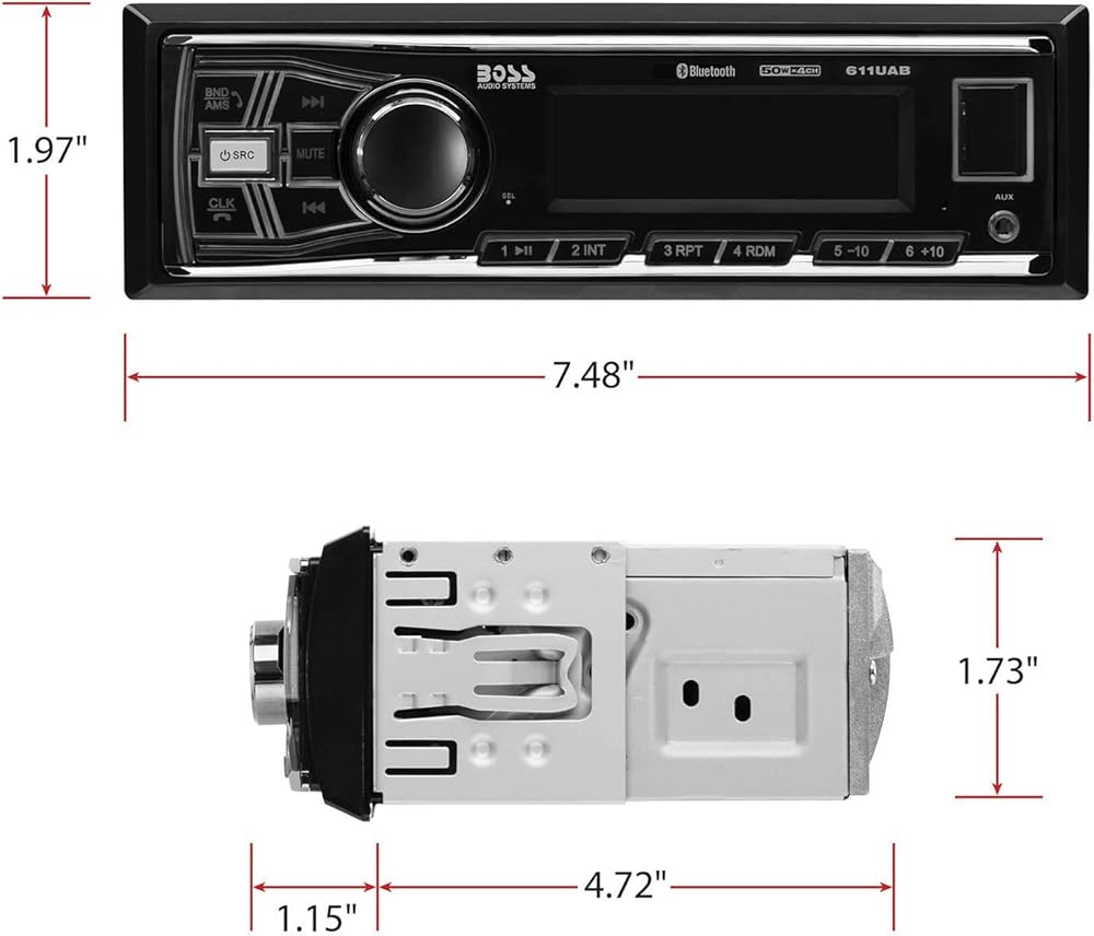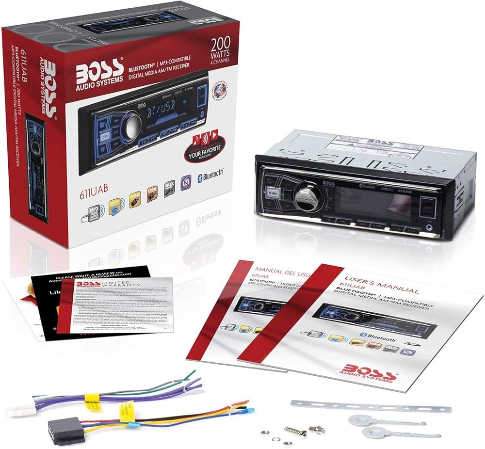 The 2-pack of Boss 611UAB is a single Din mechless car receiver that has USB, SD ports, front AUX and Radio built-in. The car receiver features an active-matrix display monitor, illuminated buttons and equalizer presets, along with built-in hands-free Bluetooth and tuner preset. This car audio receiver is incredibly powerful, omitting a whopping 50 watts x 4 Max power straight to your speakers. This digital media receiver is compatible with the audio output from smartphones and MP3 players alike, plus it's a really safe option. Other radios and audio setups require manual work, but this model has Bluetooth capabilities, so you can make adjustments and change songs with your voice. Get the most out of your vehicle's audio performance with the 2-pack of Boss 611UAB Single Din USB/SD AUX Bluetooth Multimedia Radio Car Stereo Receiver.