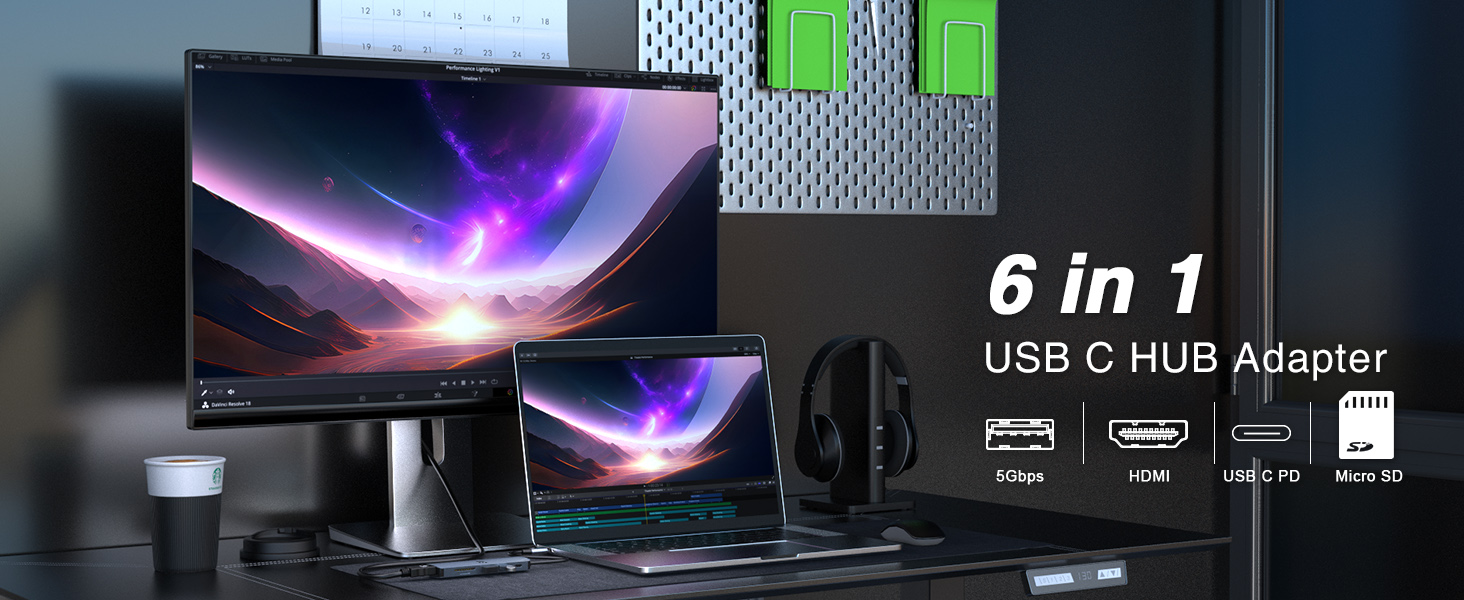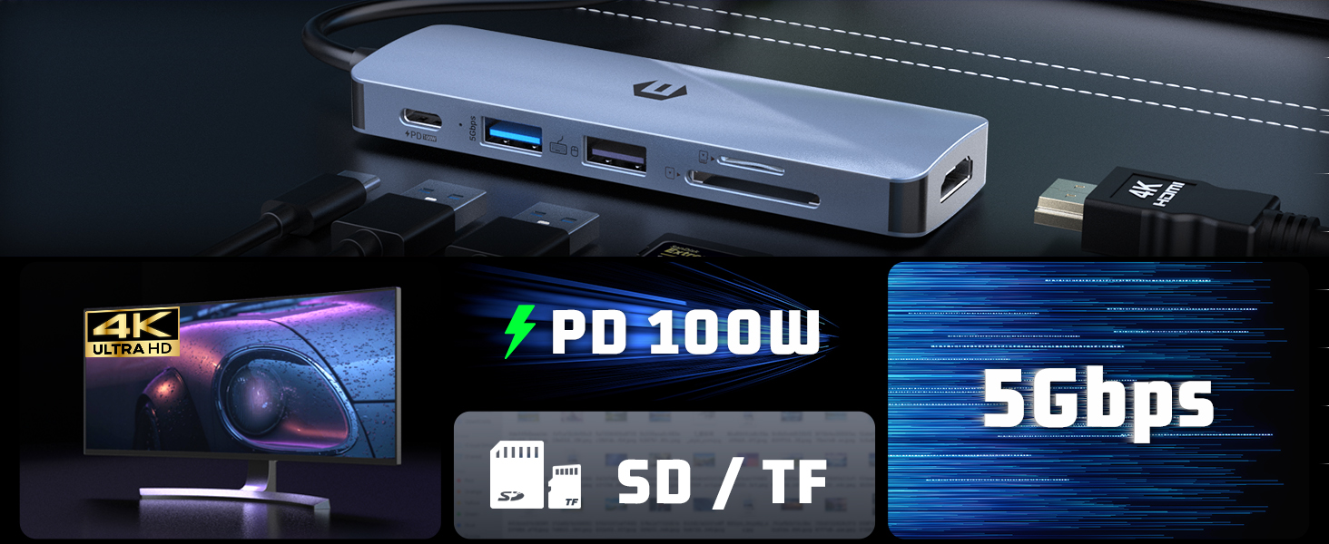 【موزع USB C 6 في 1 】ارفع من تنوع جهاز الكمبيوتر الخاص بك مع 4K عند 30 هرتز HDMI، USB-A 3.0 5 جيجابت في الثانية، USB-A 2.0، شحن PD 100 واط، وفتحات بطاقة SD/TF. هذا المركز الأنيق قابل للتوصيل والتشغيل ومناسب للمنزل أو المكتب أو السفر.