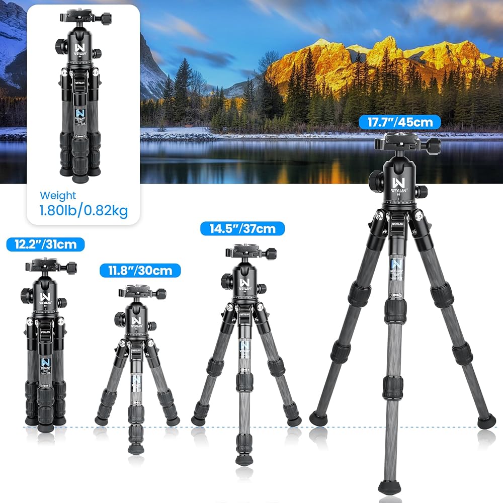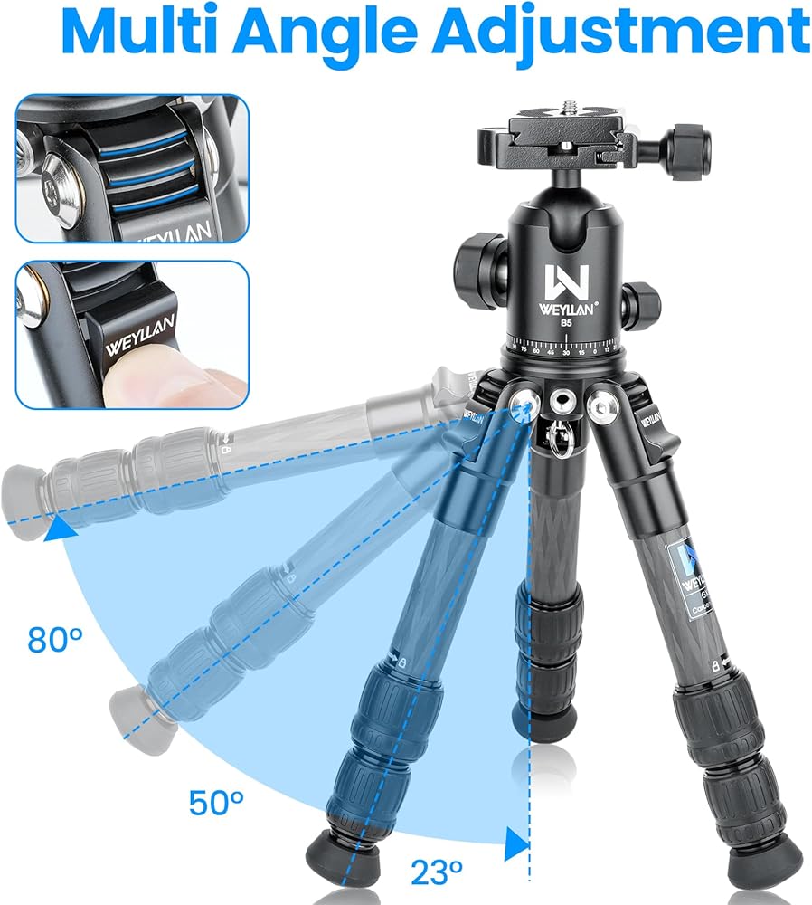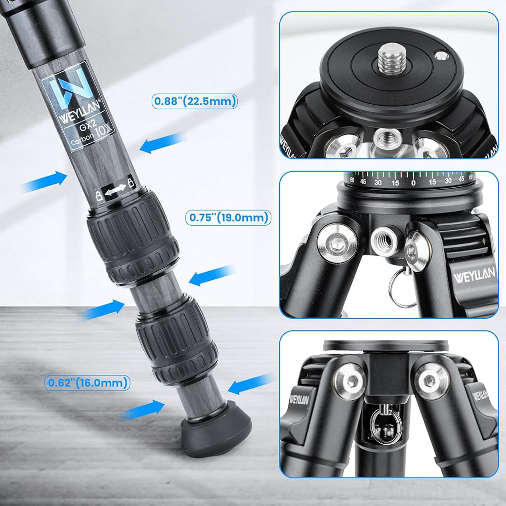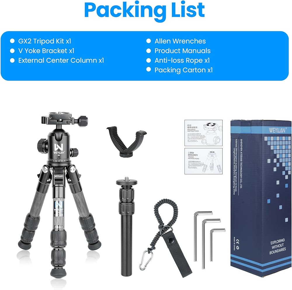 حامل ثلاثي صغير للكاميرا من ألياف الكربون WEYLLAN GX2، حامل ثلاثي محمول خفيف الوزن على سطح الطاولة، تصميم مضغوط بعمود مركزي خارجي، حامل ثلاثي للسفر مع رأس كروي 360 درجة ودعامة على شكل حرف V لكاميرا DSLR