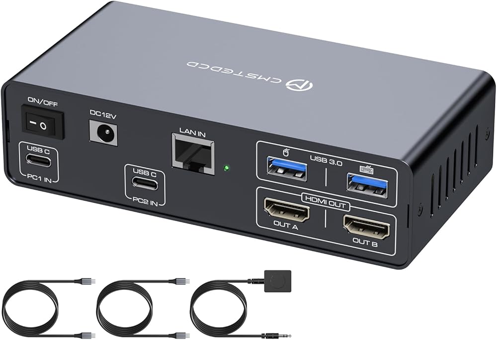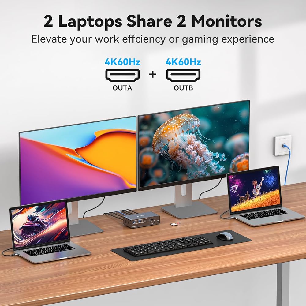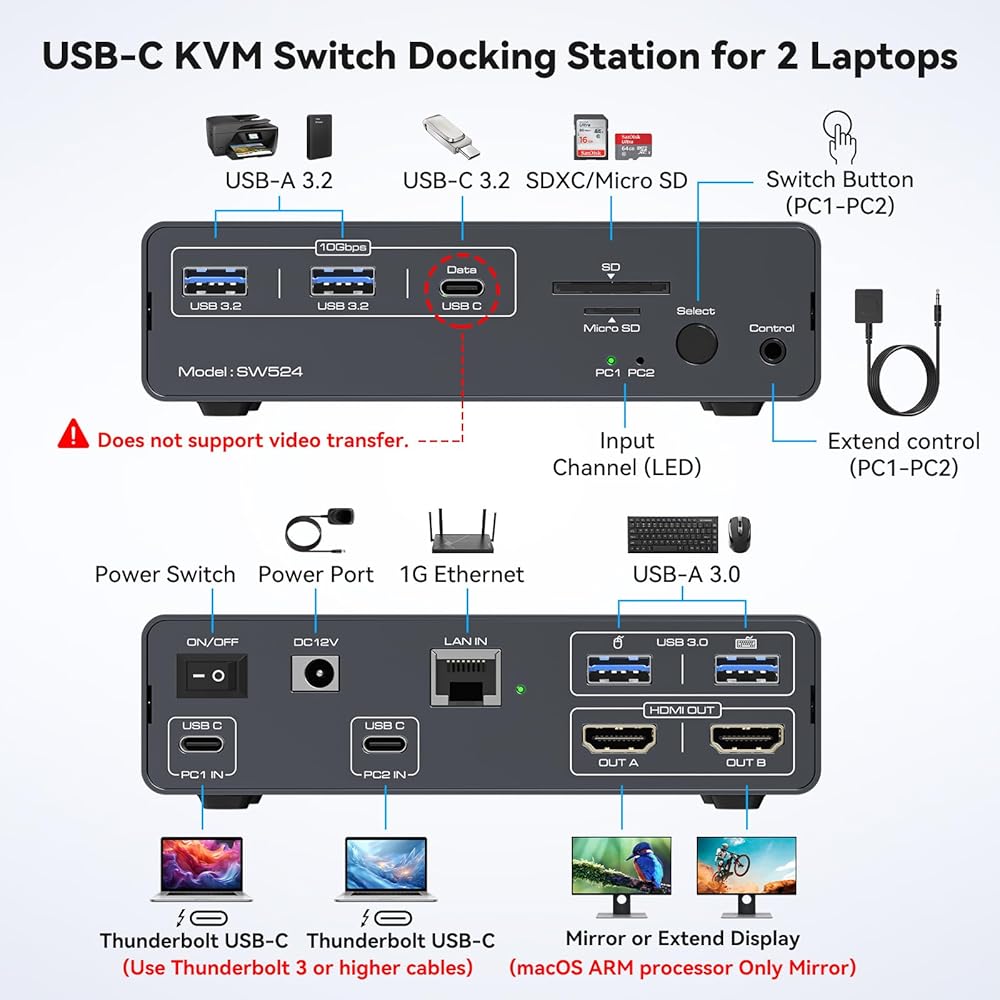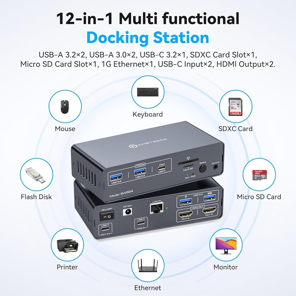 【12-in-1 laptop Docking Station】Allows two laptops to share the following expansion ports: 2*5Gbps USB3.0, 1*1000Mbps Ethernet port, 2*4K60 HDMI Display, 2*10Gbps USB3.2, 1*10Gbps USB C , 1*SD, 1*microSD card. (Please note that two laptops cannot use the docking station at the same time.)