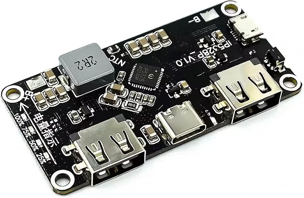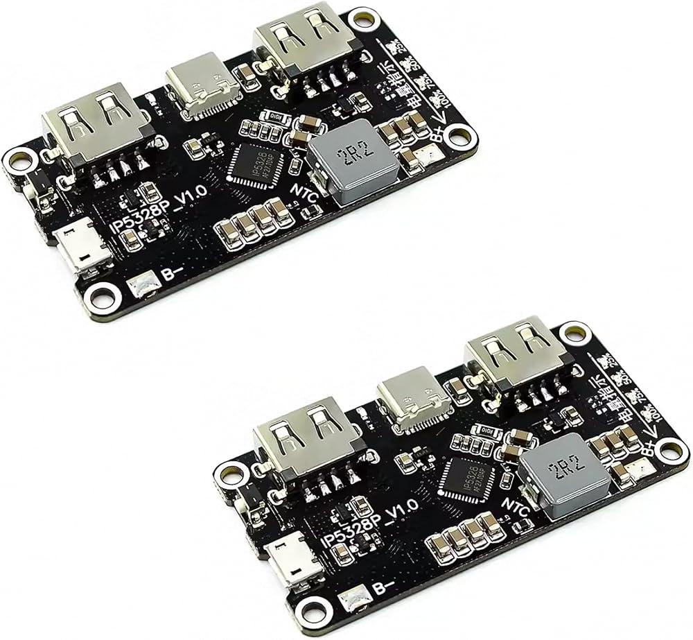 Charging.The IP5328P has a constant current, constant voltage lithium battery charge management system that supports a synchronous switch structure. Different charging voltage specifications can be automatically matched. When the battery voltage is less than 3V, 250mA trickle charging is used; When the battery voltage is greater than 3V, enter the input constant current charging, battery end charging current 5.0A; When the battery voltage is close to the set battery voltage, enter the constant voltage charging; When the charging current at the battery end is less than 300mA and the battery voltage is close to the constant voltage, stop charging. After charging, if the battery voltage is lower than 4.1V, charge the battery again.The IP5328P automatically adjusts the charging current to accommodate adapters with different load capacities. The IP5328P does not support the same charge and discharge. In the charging state, the output discharge port is closed to prevent the input high voltage from damaging the charged device.boost: The IP5328P integrates a synchronous switch converter system that supports high voltage output, supports 5V12V wide voltage range output, and the load capacity is 5V - 3.1A, 7V - 2.4A, 9V - 2.0A, 12V - 1.5A. Switching frequency 375KHz. Built-in soft start function to prevent failure caused by excessive impulse current during startup, integrated output overcurrent, short circuit, overvoltage, overtemperature and other protection functions to ensure stable and reliable system work. The output current of the booster system can be automatically adjusted with the temperature to ensure that the IC temperature is below the set temperature.Package included: 2pcs IP5328P Dual USB Battery Step-Up Power Bank Bidirectional 18W Fast Charging Module Mobile Power Motherboard 3.7V to 5V9V12V Boost Voltage QC3.0 FCP AFC MET SFCP Quick Charge Type-C