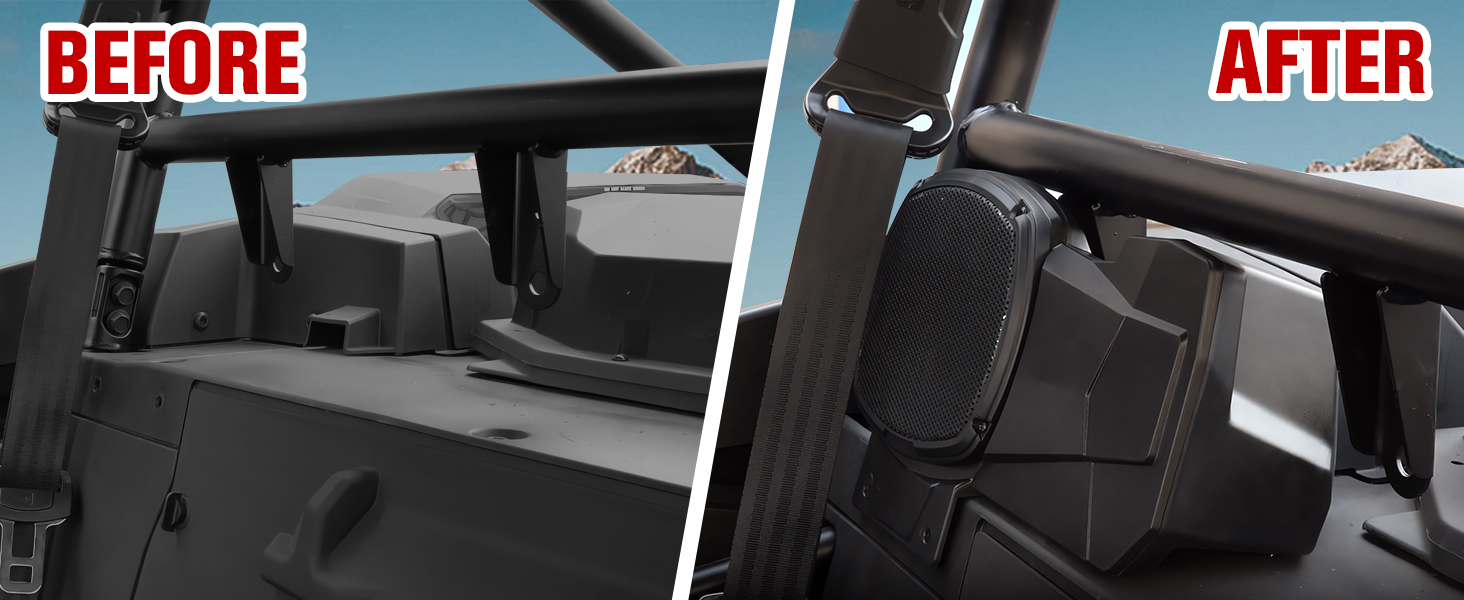 سهلة التركيب: لا حاجة للقطع، حجم دقيق، يمكن تركيب حاوية مكبر الصوت UTV بشكل جيد في 5 دقائق. تتضمن العبوة زوجًا واحدًا من دعامات السماعات الخلفية (يسارًا ويمينًا) مع أدوات التركيب وتعليمات التثبيت