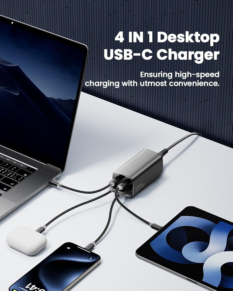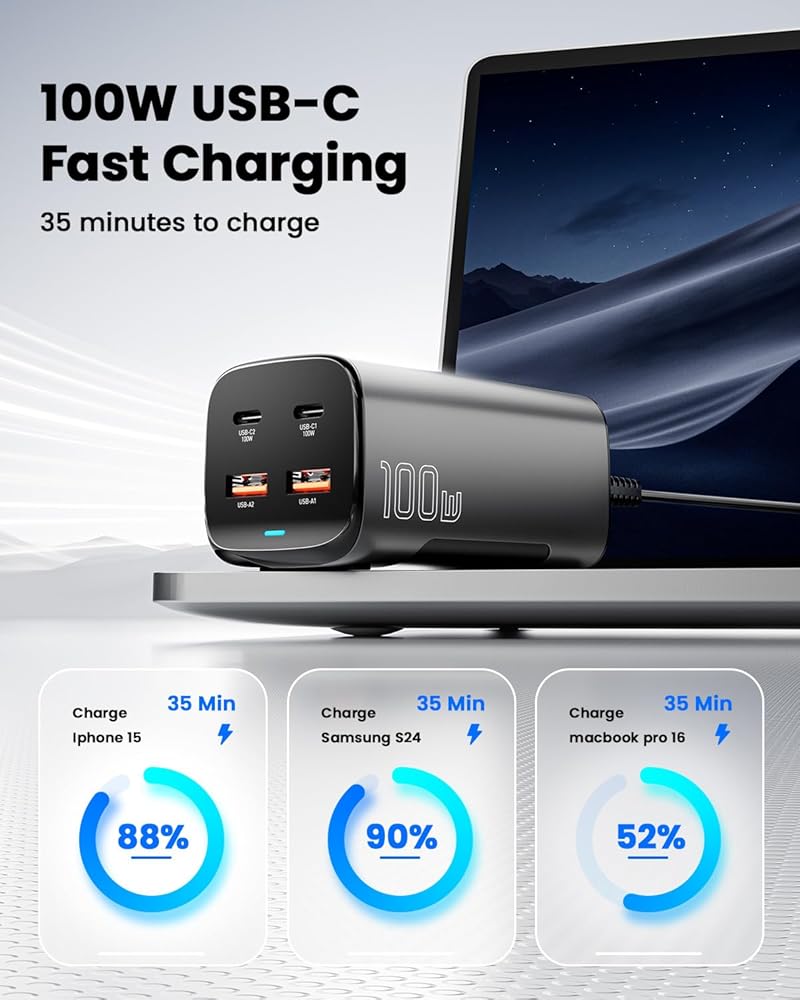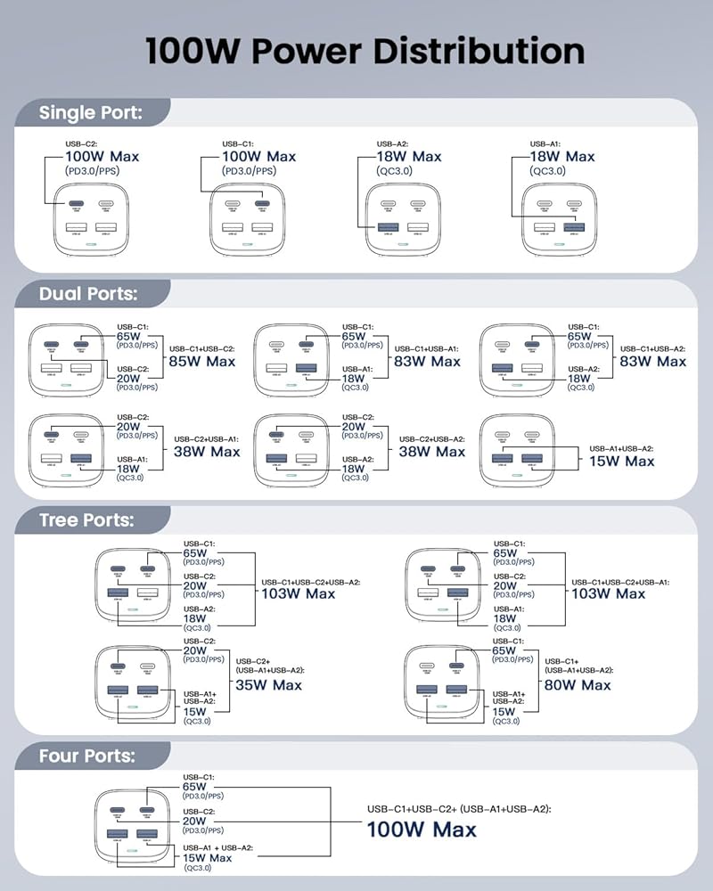 • 【شحن 4 أجهزة في وقت واحد】مع منفذي USB-C ومنفذي USB-A يوفران إجمالي 100 واط من الطاقة. عند الشحن بمنفذ واحد، يدعم منفذ C1/C2 100 واط كحد أقصى. عند الشحن متعدد المنافذ، يحافظ منفذ C1 على إخراج 65 وات كحد أقصى، مما يضمن دائمًا إمكانية شحن جهاز كمبيوتر محمول/ماك بوك في نفس الوقت
