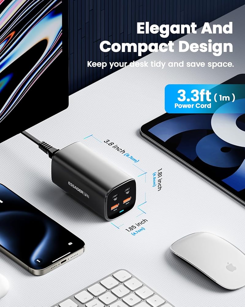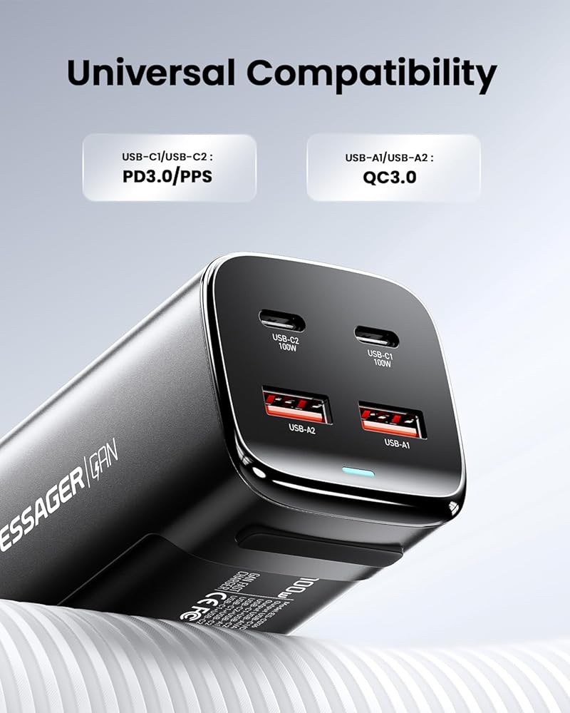 • توافق عالمي: شاحن Essager 100W GaN مع بروتوكول شحن PD/QC3.0، شحن عالي السرعة لأي جهاز محمول تقريبًا. يدعم أيضًا مصدر الطاقة القابل للبرمجة (PPS) للتوافق مع شحن Samsung فائق السرعة