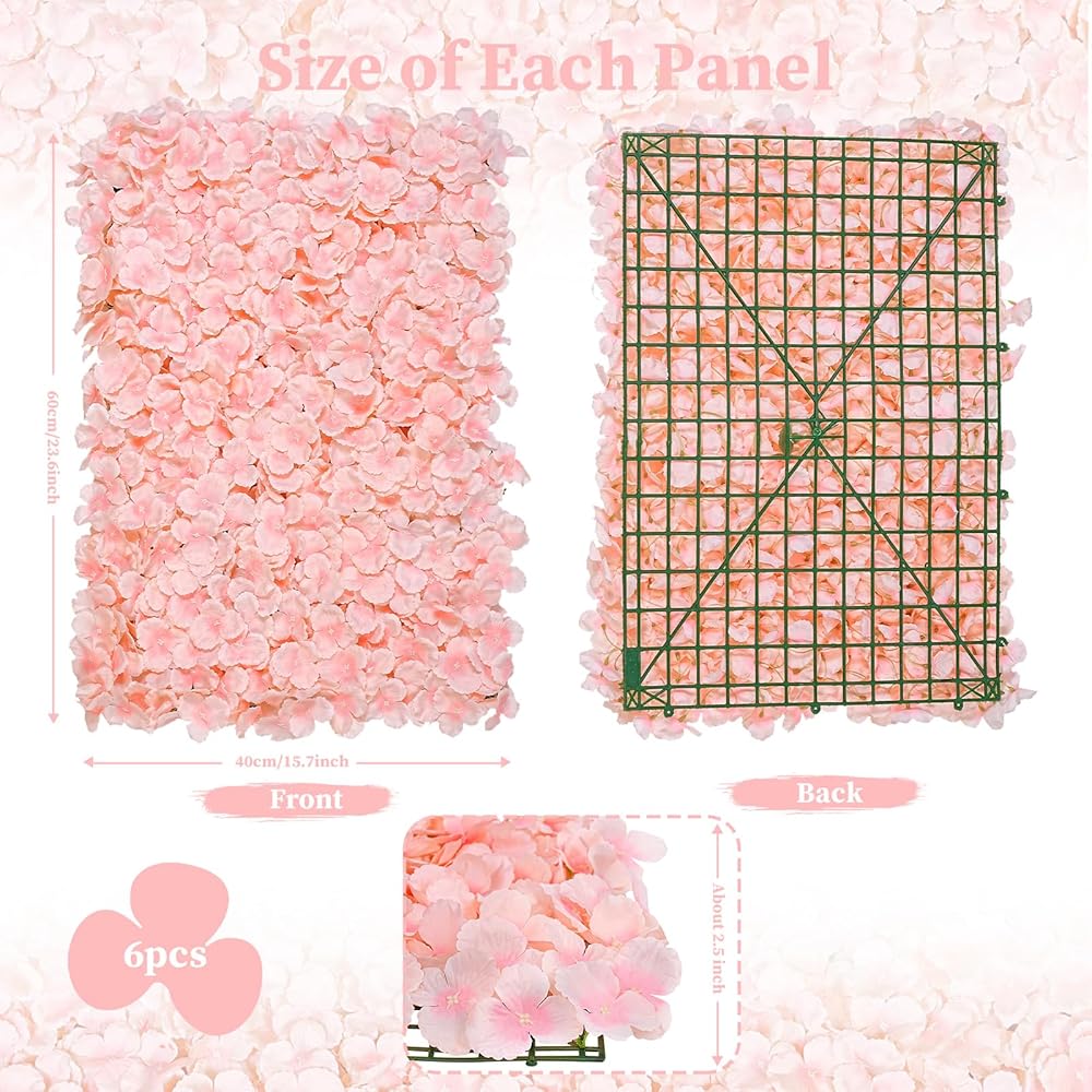 Flower Wall Backdrop: Package includes 12 pack green white flower wall panels (full of silk hydrangeas) and enough zip ties. 12 Panels Total Area Covered 4ftx8ft. The size of per flower wall panel is about 15.74x23.62x2.5 inches, great decor supplies, can add more beauty to your activities decor