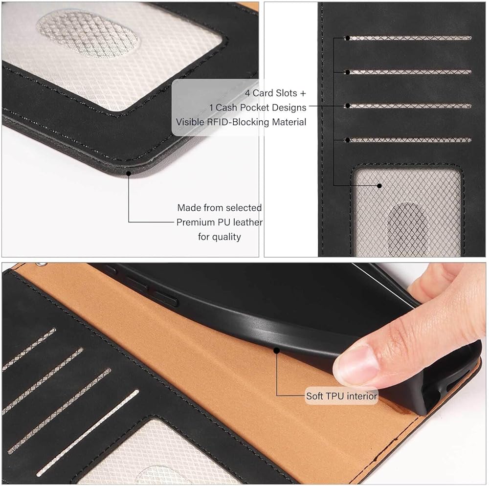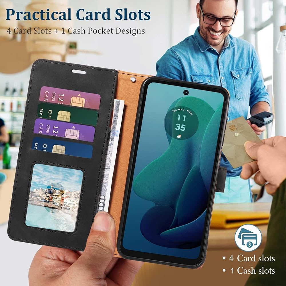 حافظة لهاتف Moto G 5G 2024 / حافظة هاتف Moto G Play 5G 2024، حامل RFID لـ 4 فتحات للبطاقات، حزام معصم، حامل واقٍ مضاد للصدمات من الجلد غطاء قلاب مغناطيسي (أسود)