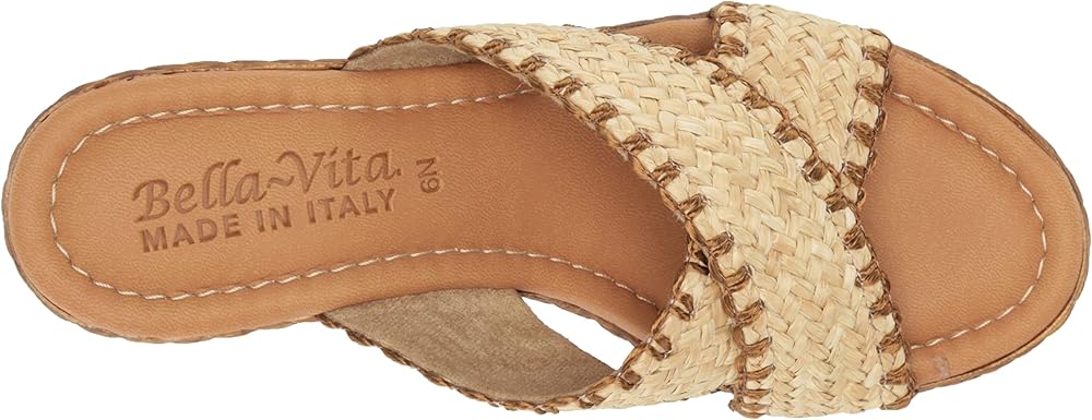 The spring Geo-Italy by Bella Vita is a classic two-banded crisscross raffia upper with a stitched accent detail that will add fashion to your summer outfits. The Italian basketweave inspired wedge is lightweight and loaded with heel-to-toe padded comfort. Easy to slip on and go, this slide sandal is a must-have.