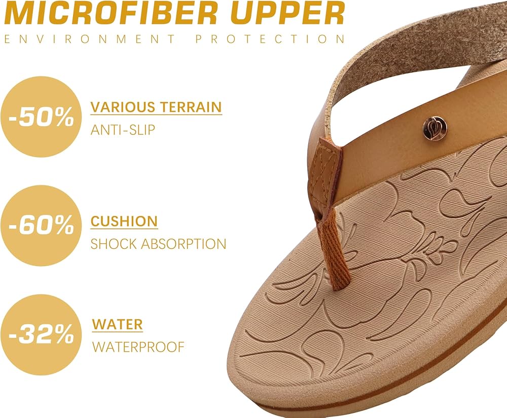 Featuring a unique Arch support footbed and Yoga Mat rubber soles, these flip flops provide unparalleled support and cushioning for your feet. The Microfiber Leather Material upper adds a touch of elegance to your beach or poolside outfit.