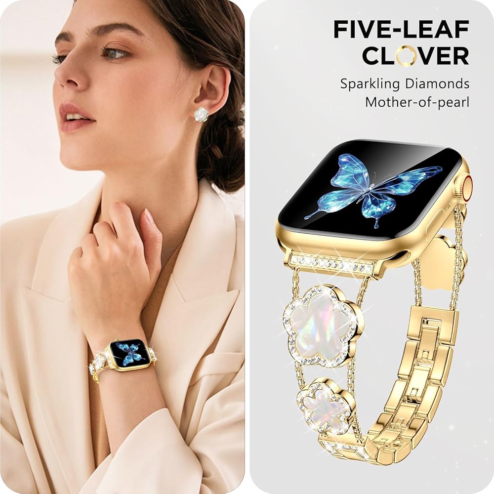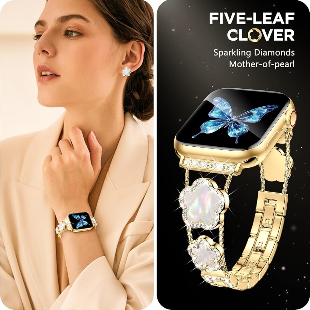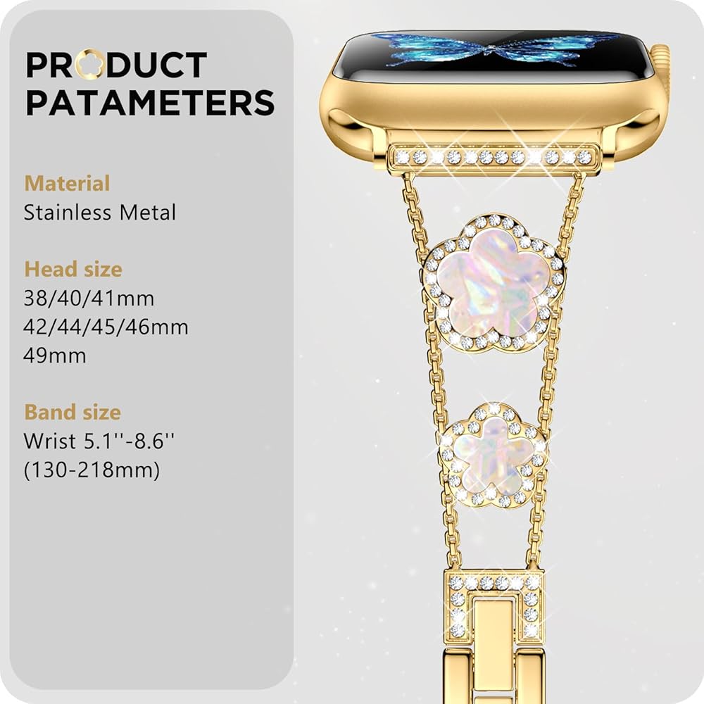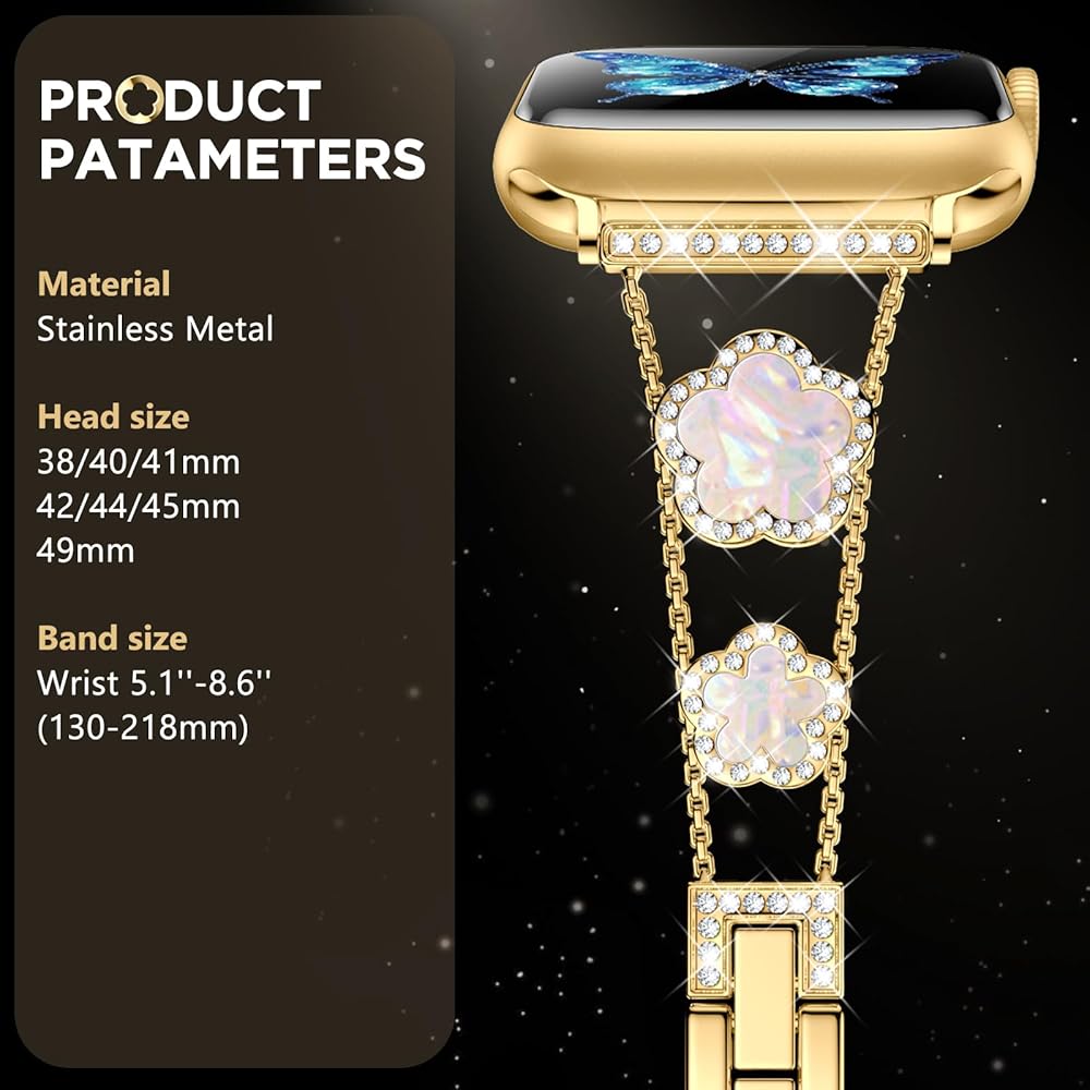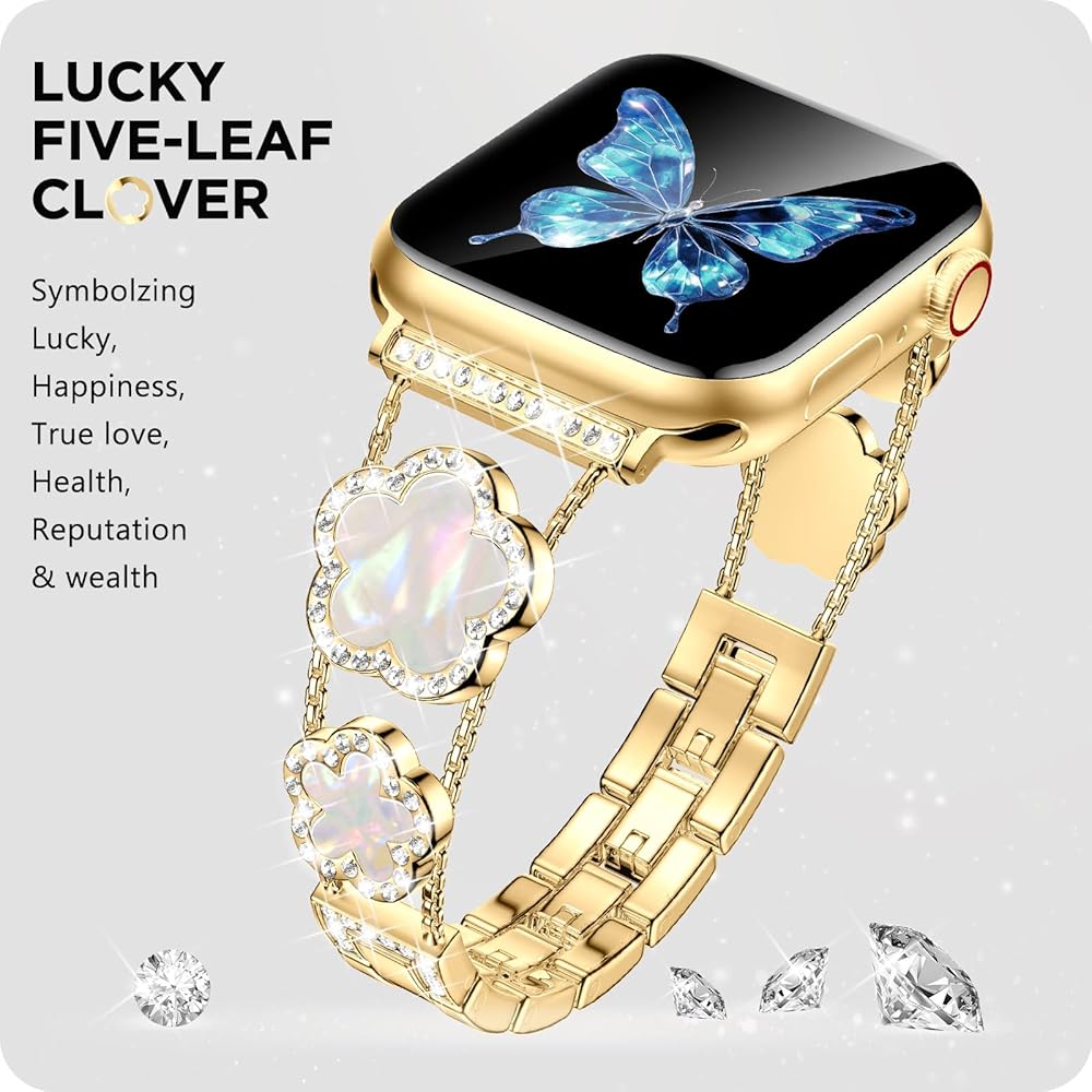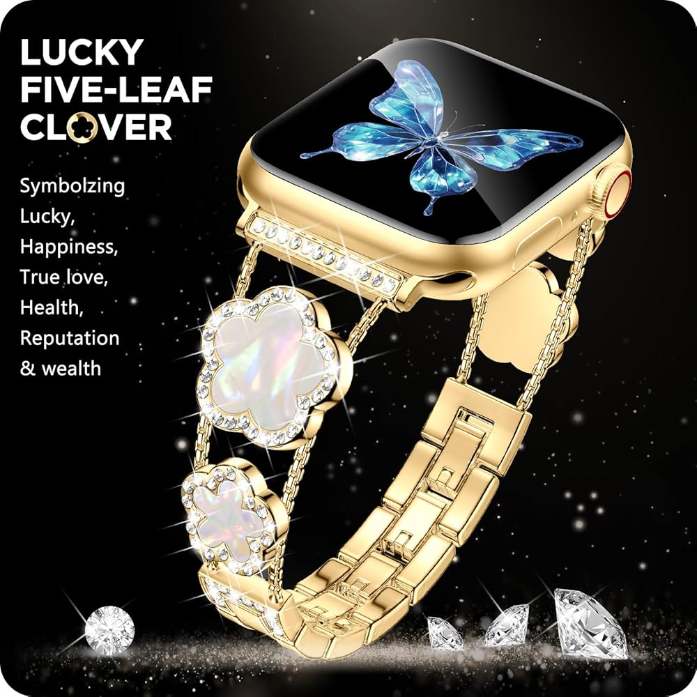 • [نماذج متوافقة] سوار ساعة أبل الذهبي المتوافق مع سوار بلينغ لاكي ذو الخمس أوراق البرسيم 40 ملم 41 ملم 38 ملم للنساء والفتيات مناسب أيضًا لسلسلة iWatch 10 9 8 7 6 5 4 3 SE. يرجى التأكد من حجم ساعتك بعناية قبل الطلب.