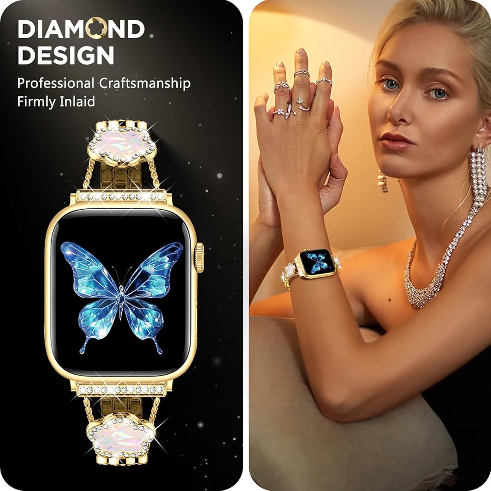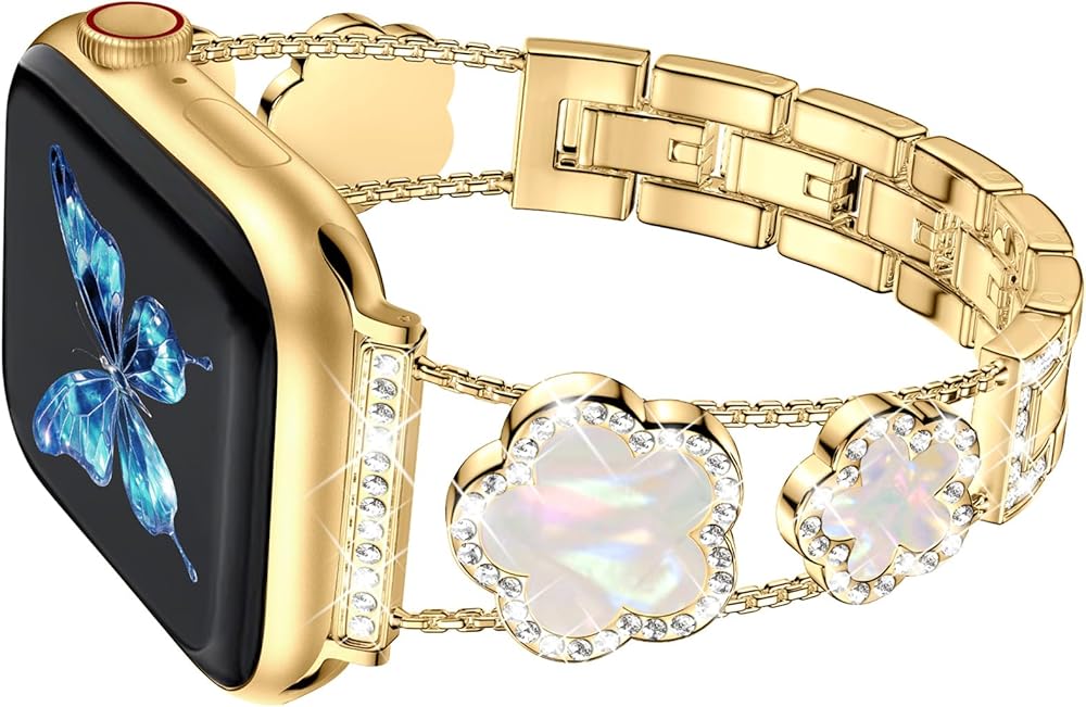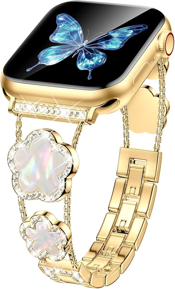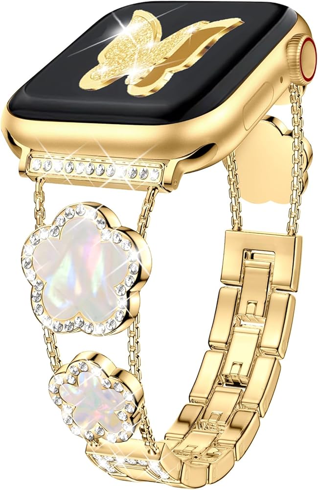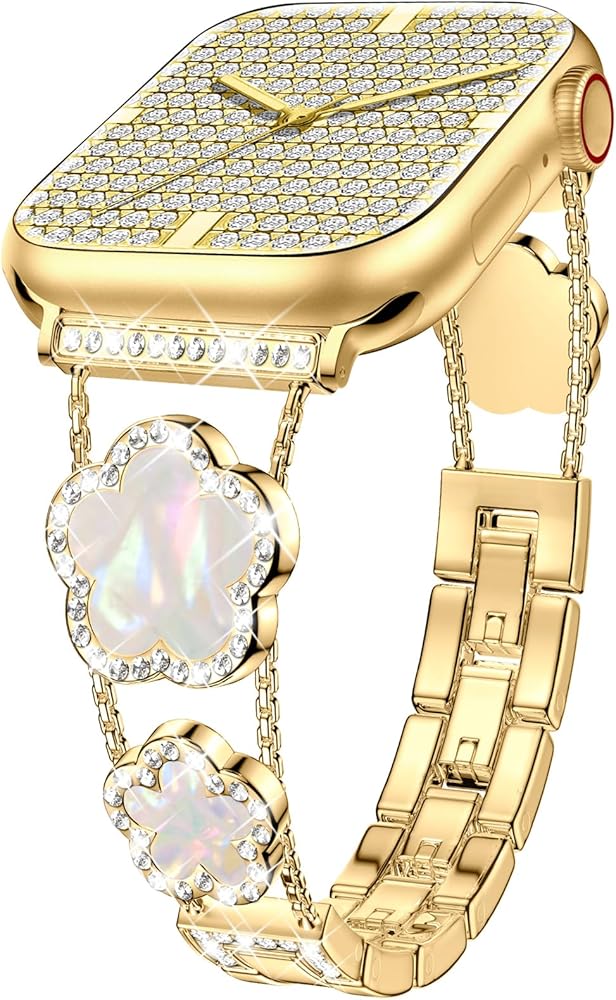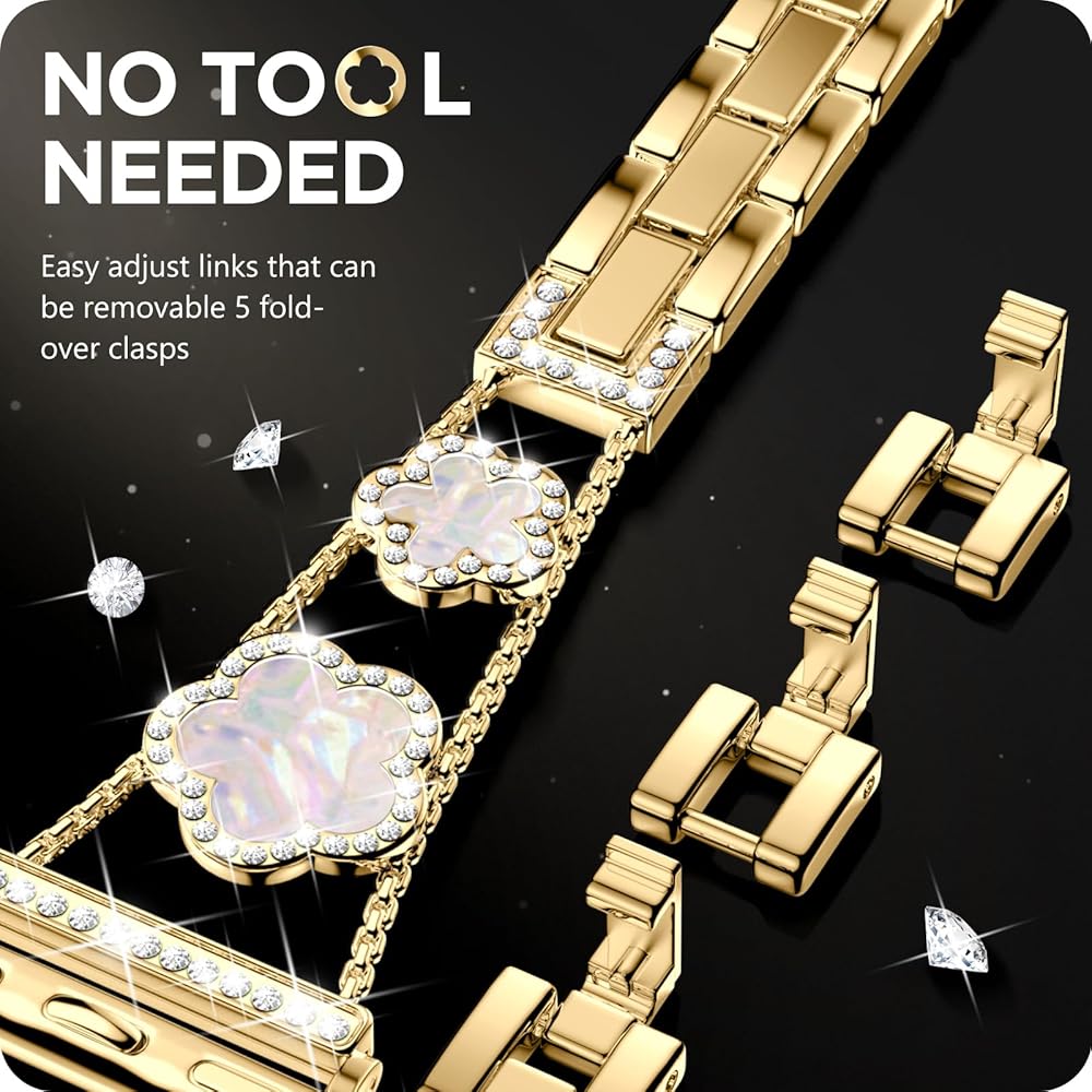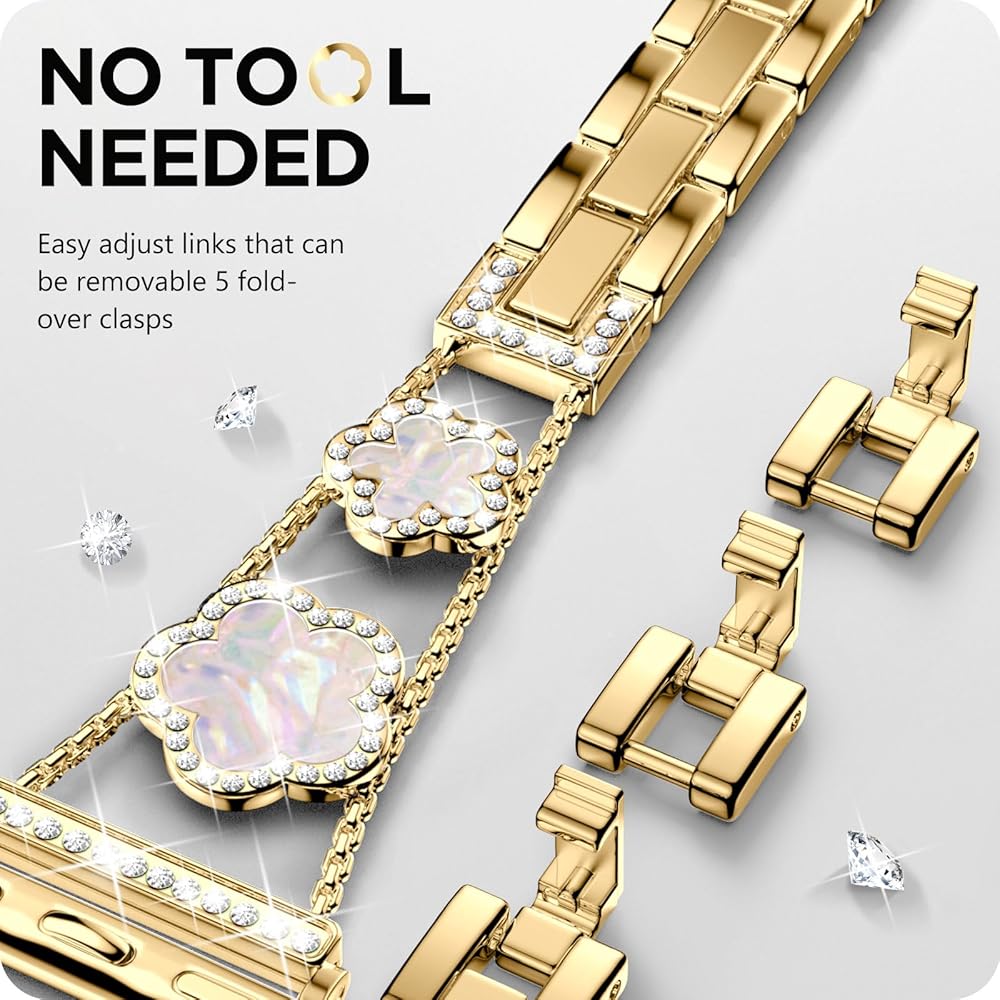 • [نماذج متوافقة] سوار ساعة أبل الذهبي المتوافق مع سوار بلينغ لاكي ذو الخمس أوراق البرسيم 40 ملم 41 ملم 38 ملم للنساء والفتيات مناسب أيضًا لسلسلة iWatch 10 9 8 7 6 5 4 3 SE. يرجى التأكد من حجم ساعتك بعناية قبل الطلب.