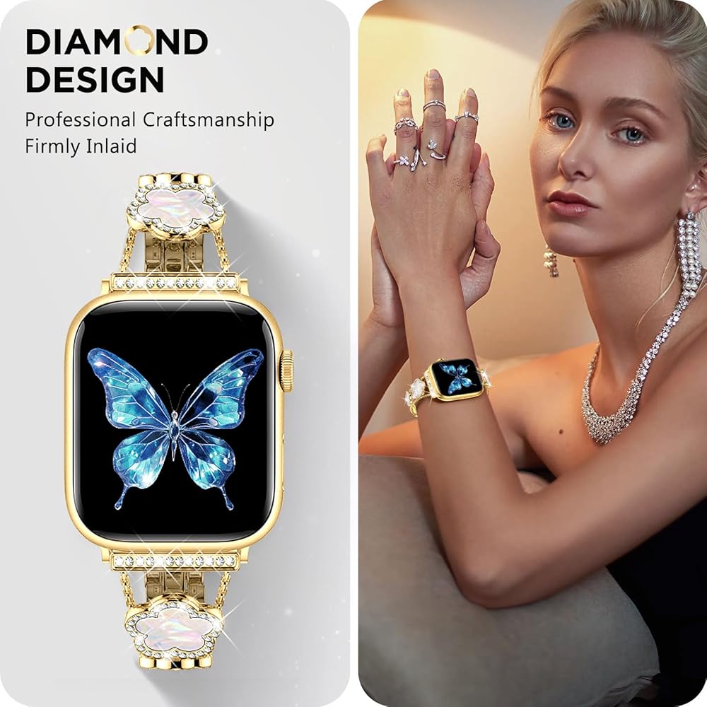 • [تصميم فريد] ترمز أحزمة ساعة التفاح الأنيقة المتوافقة مع خمس أوراق البرسيم XYF للنساء إلى الحظ والأمل والصحة والسعادة والحب وثروة السمعة. تستخدم أحزمة iwatch الذهبية المتوافقة هذه للنساء مقاس 40 مم و41 مم و38 مم براعة مرصعة بالألماس، ليس فقط كحزام ساعة ولكن أيضًا كقطعة مجوهرات رائعة. أحزمة الأساور الفاخرة تجعل ساعتك أكثر جاذبية وتحظى بالكثير من الإطراء.